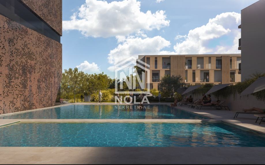 Središnji bazenski prostor kod centralne zgrade oblikovan je kao tiha, vizualno profinjena oaza, uz dječji dio i sunčalište savršeno za popodnevni odmor. Tu je i moderno restoran koji dodatno podižu kvalitetu života unutar kompleksa.