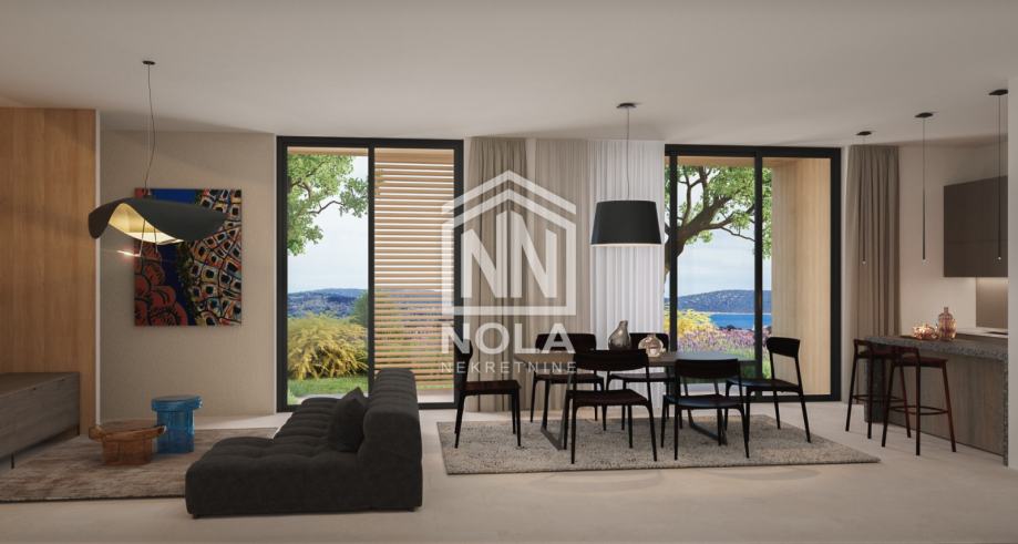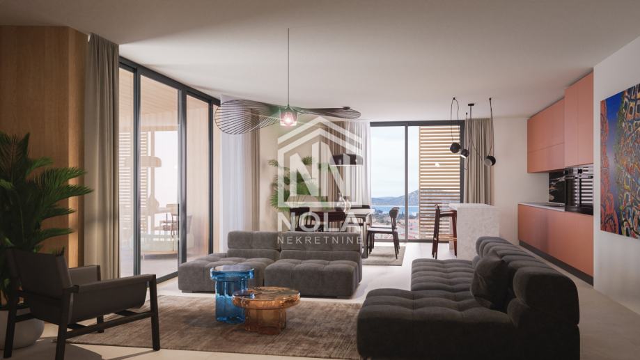 Dnevni boravak sa staklenim stijenama otvara se prema velikoj terasi i stvara osjećaj fluidnog, prozračnog životnog prostora. Interijer je osmišljen tako da osigura maksimalnu udobnost i sofisticiranost svakodnevice.