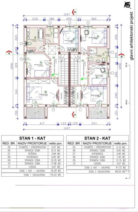 Ukupna površina apartman je 86 m2, raspoređeno na dvije etaže,