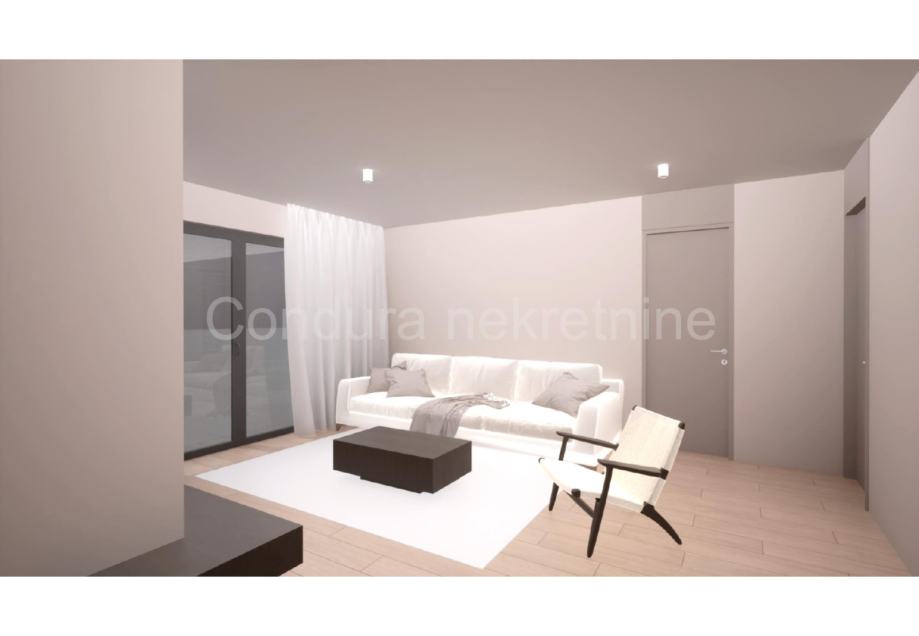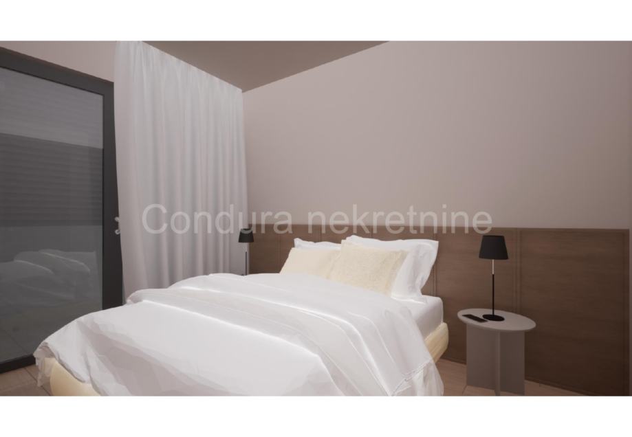 Stan se sastoji od ulaznog prostora, tri udobne spavaće sobe, prostranog dnevnog boravka s kuhinjom i blagovaonicom, kupaonice, toaleta i spremišta. Velika terasa s pogledom na more i vrt od 123 m² pružaju izuzetno ugodan prostor za opuštanje i uživanje na otvorenom, dok pozicija same nekretnine osigurava pristup svim sadržajima uz obalu.