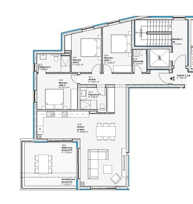 Stan S10 na II. katu ukupne površine 125,50 m2 sastoji se od ulaza, hodnika, vešeraja, kupaonice 1, dvije spavaće sobe, spavaće sobe s vlastitom kupaonicom 2, kuhinje s blagovaonicom i dnevnog boravka te natkrivene terase površine 17,20 m2. Stanu pripada ostava u podrumu i jedno parkirno mjesto.