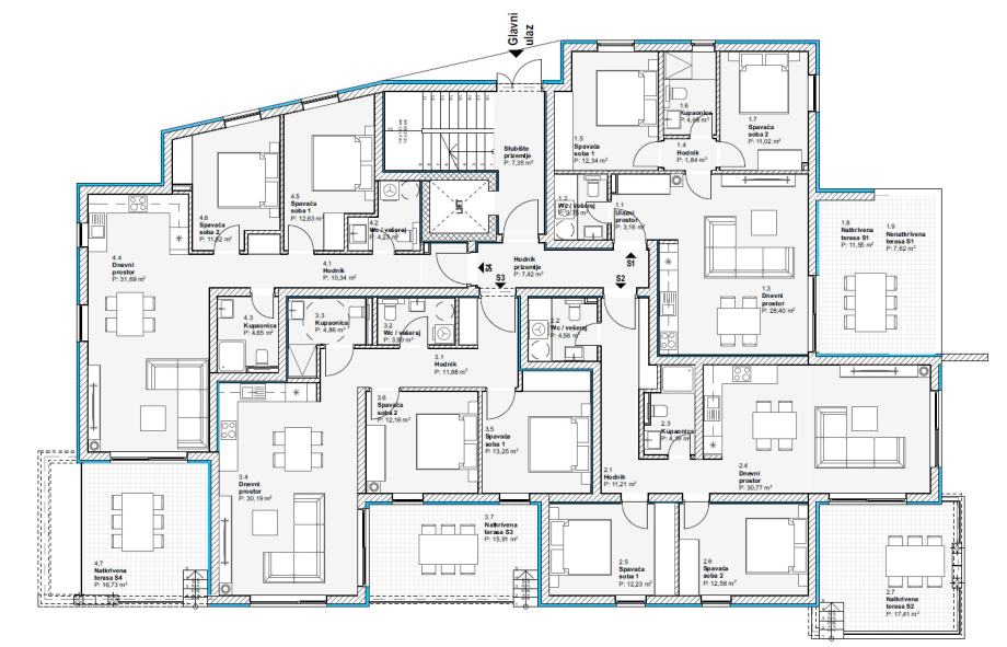 Stan S3 ukupne površine 84,20 m2 sastoji se od ulaza, WC-a/vešeraja, kupaonice, hodnika, dvije spavaće sobe, kuhinje s blagovaonicom i dnevnog boravka te natkrivene terase površine 15,91 m2. Stanu pripada ostava u podrumu i jedno parkirno mjesto.