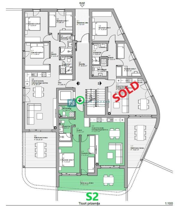 Stan S2 ukupne površine 81,21 m2 (stambena površina 59,74 m2 + terasa 21,47 m2) + vrt 45,22 m2 + parking 12,50 m2 nalazi se u prizemlju. Orijentiran je prema južnoj strani. Sastoji se od hodnika, WC s praonicom, kupaonice, dvije spavaće sobe, kuhinje s blagovaonicom i dnevnog boravaka s izlazom na natkrivenu terasu površine 21,47 m2 i vrt površine 45,22 m2. Stanu pripada parkirno mjesto u dvorištu zgrade. Cijena iznosi 320.000 € (PDV uključen - kupac je oslobođen plaćanja 3% poreza na promet nekretninama).