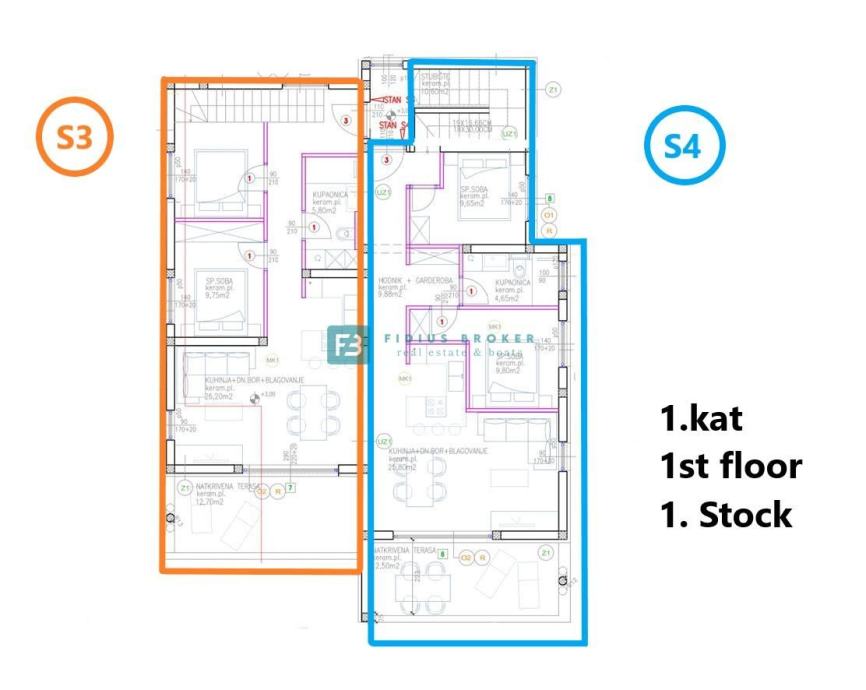 Dvoetažni stan S3 ukupne neto korisne površine 110,31 m2 proteže se na dvije etaže: 1. kat + 2. kat. Na 1. katu se nalazi hodnika s garderobom, kuhinja s blagovaonicom, dnevni boravak koji ima izlaz na natkrivenu terasu površine 12,70 m2 s koje se pruža pogled na more, kupaonica i dvije spavaće sobe. Unutarnje stepenice vode na 2. kat (krovnu terasu) gdje se nalazi ljetna kuhinja i WC. Iz ljetne kuhinje se pristupa na prostranu, nenatkrivenu i natkrivenu terasu površine čak 51,90 m2 s koje se pruža prekrasan panoramski pogled na more i grad. Stanu pripada jedno parkirno mjesto.