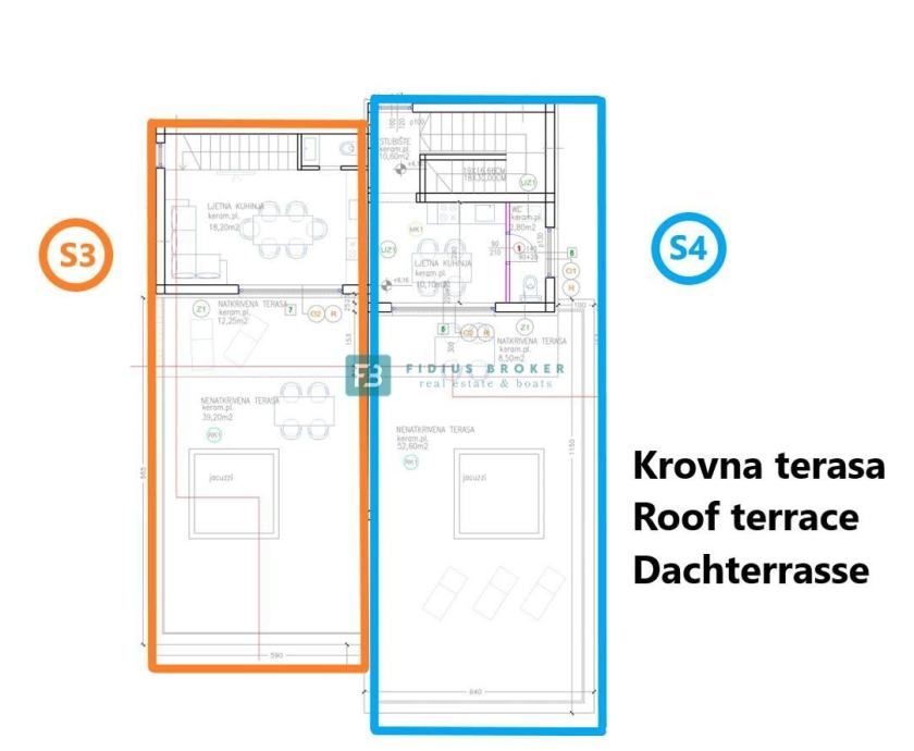 Dvoetažni stan S4 ukupne neto korisne površine 99,57 m2 proteže se na dvije etaže: 1. kat + 2. kat. Prva etaža stana sastoji se od hodnika s garderobom, kuhinje s blagovaonicom, dnevnog boravka koji ima izlaz na natkrivenu terasu površine 12,50 m2, kupaonice i dvije spavaće sobe. Unutarnje stepenice vode na drugu etažu stana koji se sastoji od ljetne kuhinje i WC-a. Iz ljetne kuhinje se pristupa na prostranu, nenatkrivenu i natkrivenu terasu površine čak 61,10 m2 s koje se pruža prekrasan pogled na more i grad. Stanu pripada jedno parkirno mjesto. Cijena iznosi 318.624 €.