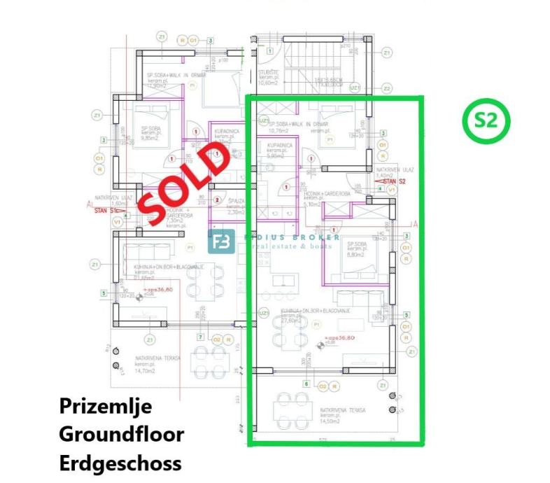 Stan S2 ukupne neto korisne površine 86,07 m2 nalazi se u prizemlju. Sastoji se od natkrivenog ulaza, hodnika i garderobe, kuhinje s blagovaonicom i dnevnim boravkom koji ima izlaz na natkrivenu i nenatkrivenu terasu površine 44,99 m2 i vrt površine 60,42 m2, kupaonice, dvije spavaće sobe od kojih jedna spavaća soba ima walk-in ormar. Stan ima zaseban ulaz i pripadaju mu dva parkirna mjesta. Cijena iznosi 249.603 €.