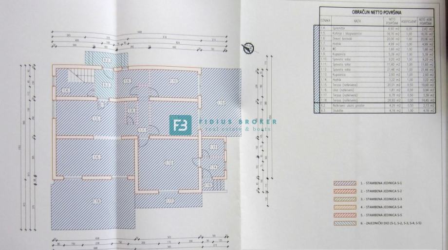 Stan S1 proteže se na cca 270 m2 korisne površine tlocrtno, koji pomnožen s obračunskim koeficijentom daje 142,41 m2. Stan zanimljivog i funkcionalnog rasporeda proteže se kroz cijelu etažu prizemlja. Sastoji se od hodnika, dvije kupaonice, WC-a, spremišta, kuhinje, blagovaonice, tri spavaće sobe s pripadajućim velikim terasama, dnevnog boravka s izlazom na natkrivenu terasu veličine cca 29 m2 opremljene priključkom za TV, rasvjetom, i ventilatorom. Stanu pripada dvorište površine cca 75 m2 te dva parkirna mjesta s mogućnošću smještaja i trećeg vozila na parceli. Stan je kompletno namješten i spreman za useljenje.