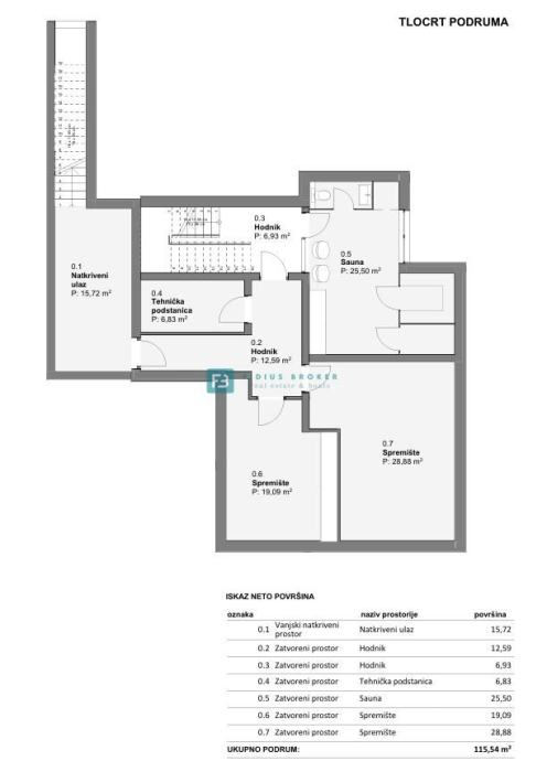 PODRUM: natkriveni ulaz, tehnička soba, hodnik, sauna, vinoteka, dva spremišta