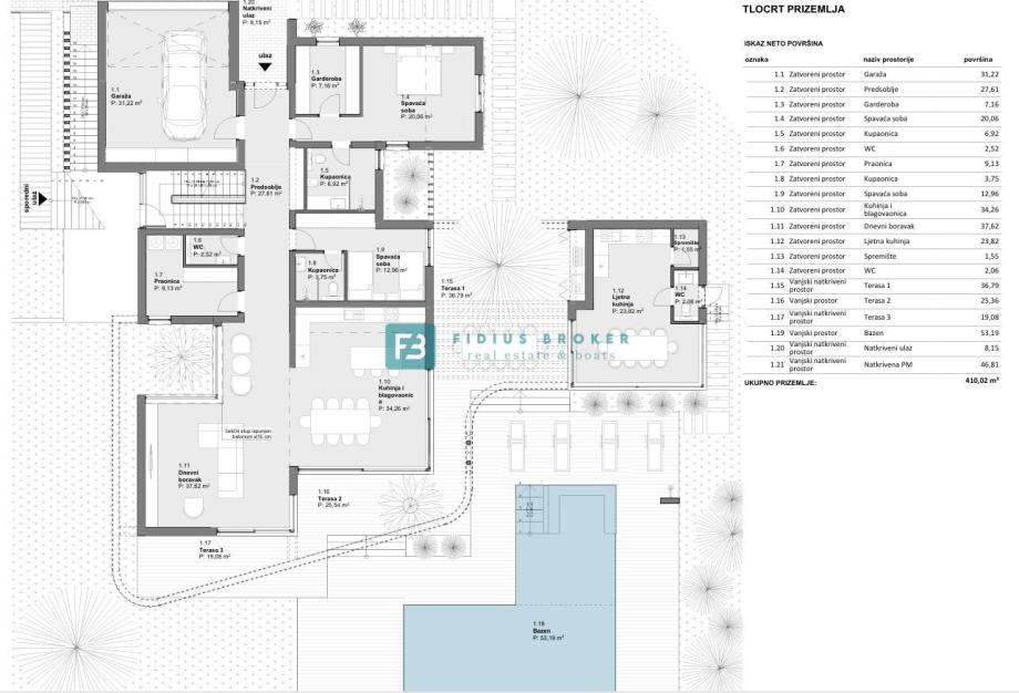 PRIZEMLJE: garaža, 6 parkirnih mjesta, praonica, WC, dvije spavaće sobe s kupaonicama, garderoba, kuhinja s blagovaonicom i dnevnim boravkom koji ima izlaz na tri terase, prostrani grijani bazen (53,19 m²), sunčalište i ljetnu kuhinju