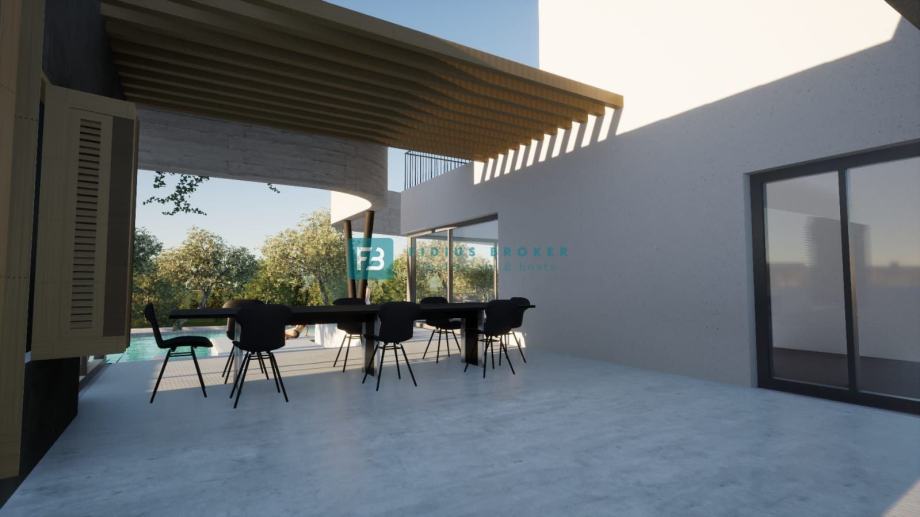 Luksuzna nekretnina se proteže na tri etaže (podrum + prizemlje + kat) s ukupnom korisnom površinom od 589,89 m2 + 140,36 m² terasa, a smještena je na prostranom zemljištu od 1499 m². Vila je trenutno u izgradnji i prema projektu će biti okružena lijepo uređenim okolišem. U sklopu ograđenog i popločanog dvorišta biti će i veliki grijani bazen od 53,19 m², te održivi vrt s automatskim navodnjavanjem. Vila će imati djelomičan pogled na more.