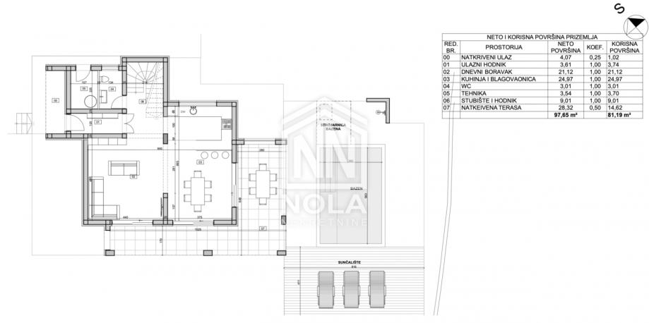 U prizemlju se nalazi otvoreni koncept dnevnog boravka povezan s kuhinjom i blagovaonicom, koji cini centralni dio kuce. Prostor je svijetao, prozracan i povezan s natkrivenom terasom i okucnicom, sto ga cini idealnim za obiteljski zivot i druzenja.