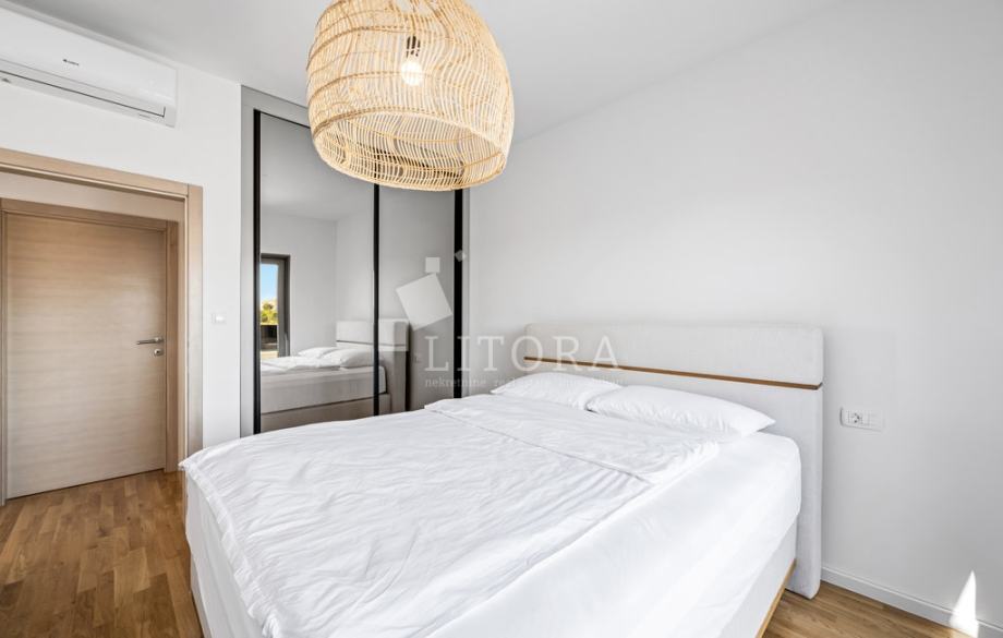 Vodice – moderno uređen penthouse s pogledom na more i jacuzzijem, u blizini plaže Hangar. U mirnom dijelu Vodica, nedaleko od popularne plaže Hangar, nalazi se novoizgrađeni penthouse koji zauzima cijelu zadnju etažu (3. kat) manje stambene zgrade. Apartman ima ukupnu korisnu površinu od 80 m² te se odlikuje suvremenim rasporedom i obiljem prirodne svjetlosti. Sastoji se od ulaznog hodnika, kupaonice, prostranog dnevnog boravka s kuhinjom i blagovaonicom te tri spavaće sobe, od kojih svaka ima izlaz na vlastitu terasu. Dnevni boravak i kuhinja imaju izlaz na veliku južno orijentiranu terasu površine 30 m² s jacuzzijem i prekrasnim pogledom na more – idealno mjesto za opuštanje i uživanje u mediteranskoj atmosferi. Apartman je potpuno namješten, a sav namještaj uključen je u cijenu nekretnine. Pripada mu jedno parkirno mjesto u dvorištu zgrade te spremište u prizemlju. Zgrada je smještena na izvrsnoj lokaciji – svega 700 m od plaže Hangar i 1.700 m od centra grada.