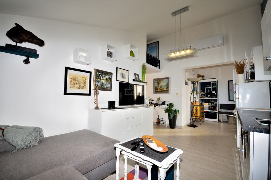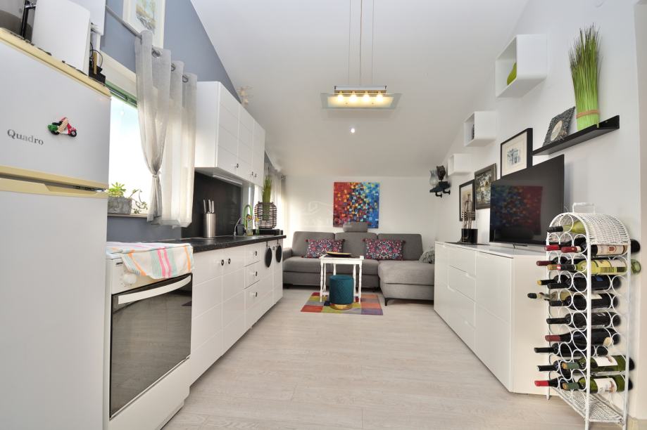 Vodice- prodaje se stan s pogledom na more u blizini plaže. Stan se nalazi na drugom katu / visokom potkrovlju stambene zgrade s ukupno 9 stambenih jedinica. Ima ukupnu neto stambenu površinu 35,74m2 i sastoji se od hodnika, spavaće sobe, kuhinje s blagovaonicom i dnevni boravak i lođe koja je u potpunosti ostakljena s mogućnosti otvaranja prozora. Stanu pripada spremište površine 5 m2 u podrumu zgrade te jedno parkirno mjesto ispred zgrade. Zgrada se nalazi na mirnoj lokaciji, od plaže je udaljena oko 450 m a od centra Vodica oko 1200 m. Stan je klimatiziran (nova klima 3.5 kW.) i namješten.