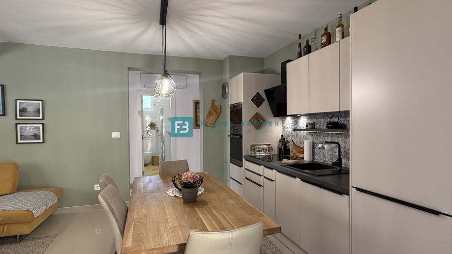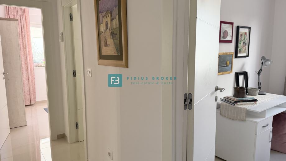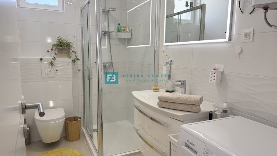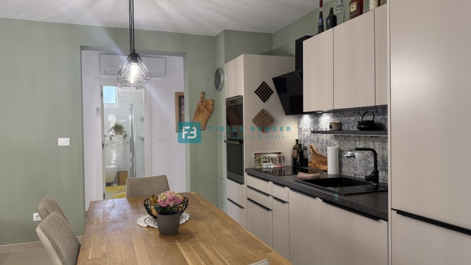 Nova stambena zgrada s 7 moderno uređenih stanova, izgrađena je 2021. godine. Nalazi se u mirnom i uređenom dijelu grada, okruženom obiteljskim kućama, udaljena samo 600 m od uređene plaže i 1100 m od centra. Od opreme izdvajamo: stiropor fasada, protuprovalna ulazna vrata, rolete s električnim podizačima, komarnici, kvalitetne keramičke pločice u beige nijansi, moderne kupaonske sanitarije, jedan klima uređaj, kompletno opremljena kuhinja.