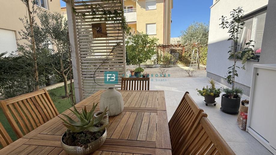 VODICE, novo, namješten stan, 600 m do plaže, vrt 155 m2, ostava (prodaja)