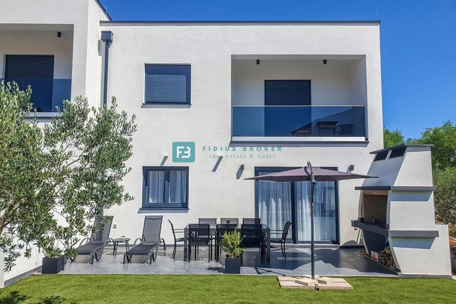 VODICE - Novi namješten dvoetažni stan s dvorištem smješten je u mirnom dijelu Vodica, udaljen svega 650 m od gradske plaže i 900 m od centra grada.