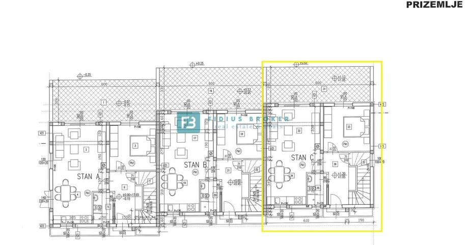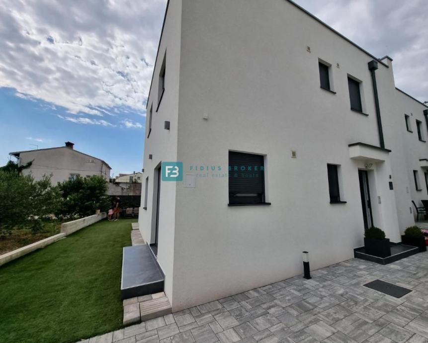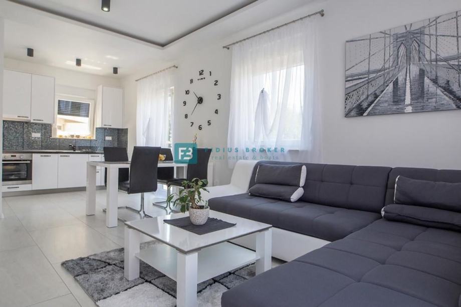 Stan modernog dizajna i funkcionalnog rasporeda površine od 130 m2 proteže se na dvije etaže: prizemlje + kat. U prizemlju se nalazi kuhinja s blagovaonicom, spavaća soba, prostrani dnevni boravak i kupaonica. Iz dnevnog boravka i kuhinje izlazi se na natkrivenu terasu i uređeno dvorište površine 90 m2 gdje se nalazi vanjski prostor za druženje sa sjedećom garniturom i roštiljem. Unutarnje stubište vodi na kat gdje se nalaze tri prostrane spavaće sobe, WC i kupaonica. Dvije sobe imaju izlaz na balkon. Kuća posjeduje vanjsko parking mjesto.