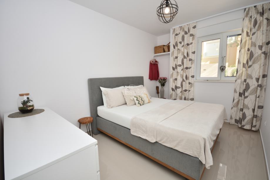 Posebnu vrijednost daje uređeni vrt – jedan dio prekriven je umjetnom travom, dok su u drugom dijelu posađene mediteranske biljke poput masline, limuna i naranče. U vrtu se nalazi i praktična vrtna kućica.