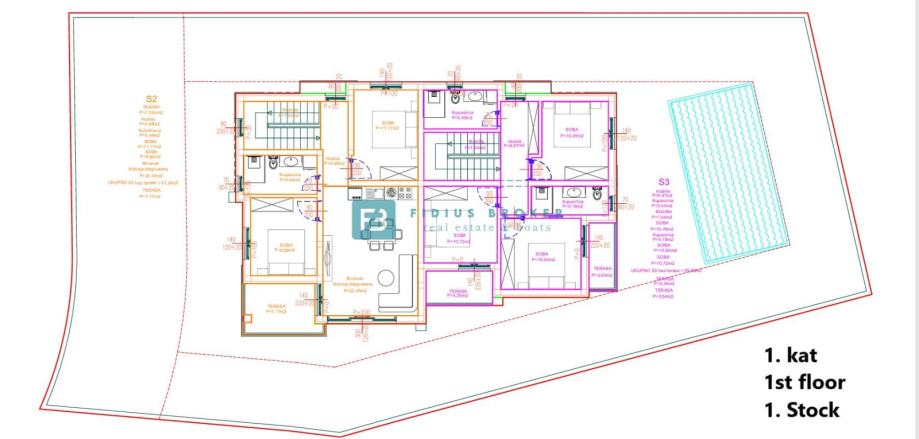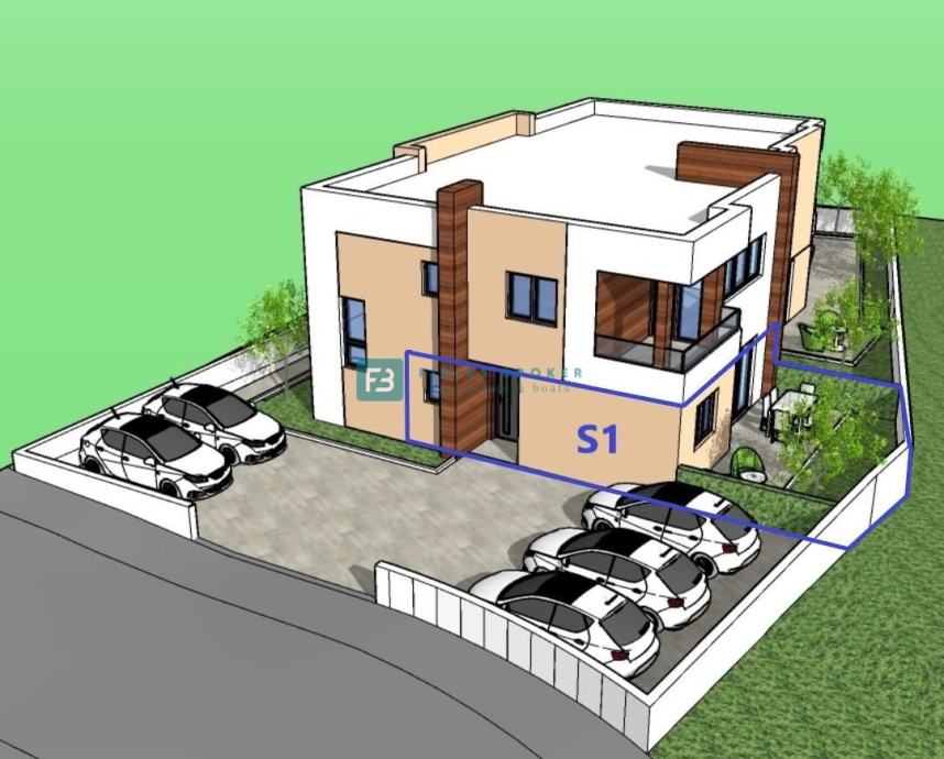 Dvoetažni stan S3 prostire se na dvije etaže: prizemlje + 1. kat, ukupne korisne površine 121,42 m2. U prizemlju površine 61,85 m2 nalazi se ulazni prostor, hodnik, ostava, kupaonica, spavaća soba te kuhinja s blagovaonicom i dnevni boravak s izlazom na terasu, bazen površine 21 m1 i prostrano dvorište od 188 m2. Unutarnje stepenice vode na 1. kat površine 59,57 m2 gdje se nalazi hodnik, kupaonica, te tri spavaće sobe, od kojih jedna ima vlastitu kupaonicu i terasu, a druga izlaz na terasu. Kući pripadaju dva vanjska parkirna mjesta i ima odvojen ulaz. Cijena iznosi 490.000 €.