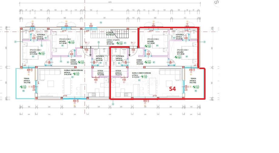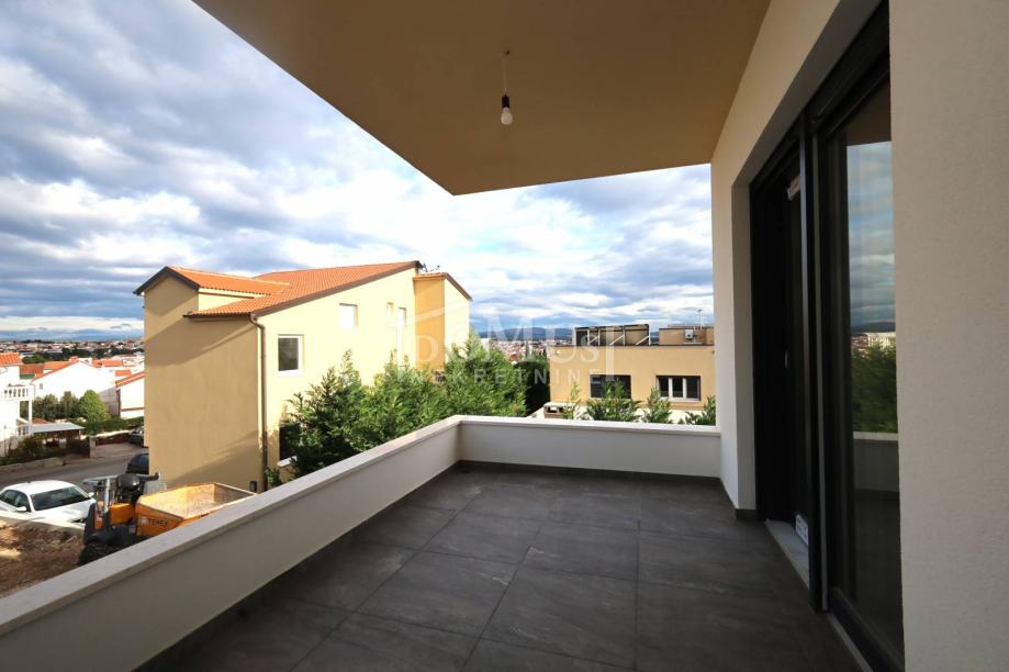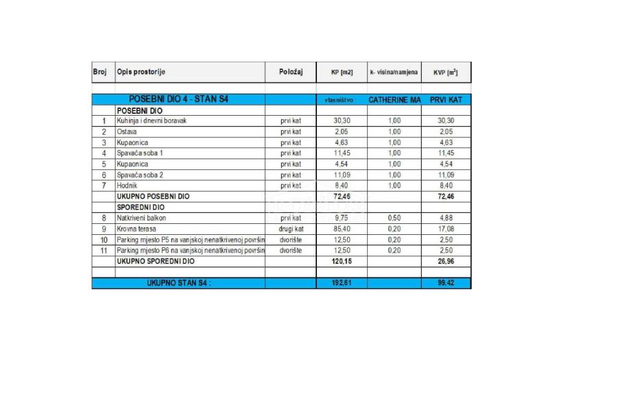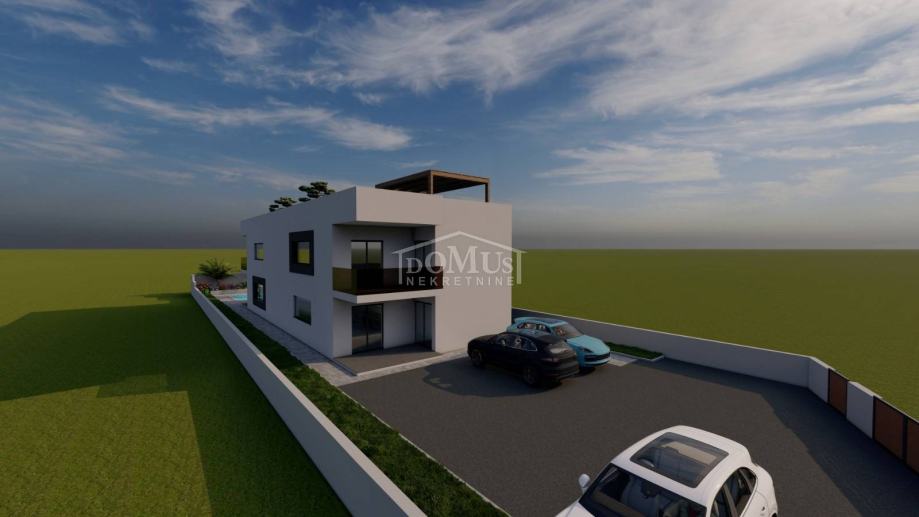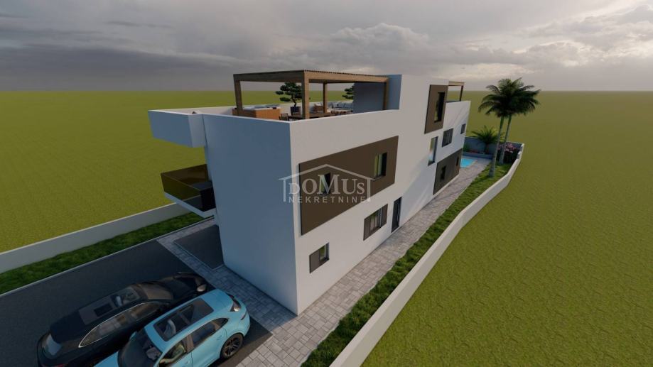 Vodice, novogradnja, atraktivna lokacija, komforan dvosobni apartman na 1. katu. Apartman S4 se nalazi u manjoj stambenoj zgradi s ukupno 4 apartmana, modernog je dizajna i funkcionalnog rasporeda s ukupno 99,42 m² korisne površine i pogledom na more. Apartman se sastoji od prostrane kuhinje s blagovaonicom i dnevnim boravkom u cjelini, hodnika, dvije spavaće sobe, od kojih jedna ima vlastitu kupaonicu, te još jedna zasebna kupaonica, ostave, natkrivene terase od 9,75 m² te krovne terase od 85,40 m² s instalacijom električne energije i vodovodnim priključcima za ljetnu kuhinju i jacuzzi. Opremljen je vrhunskim materijalima: moderna keramika i sanitarije, podno grijanje u cijelom apartmanu, trostruko staklo na prozorima te električno podizanje roleta, klima uređaji u dnevnom boravku i svim sobama. Apartmanu pripadaju dva parkirna mjesta. Apartman se nalazi 1.200 m od Plave plaže i 700 m od centra Vodica.