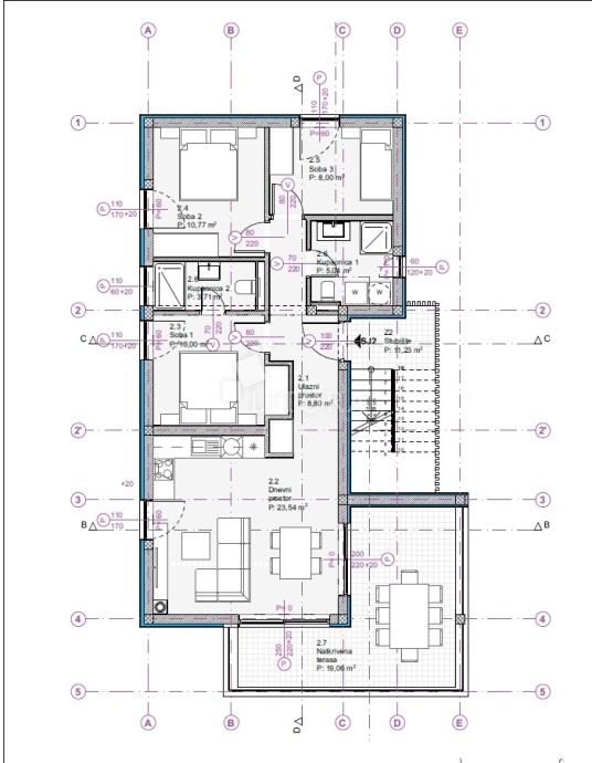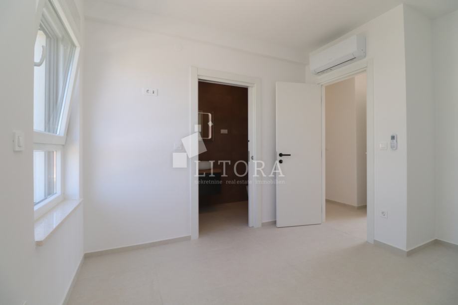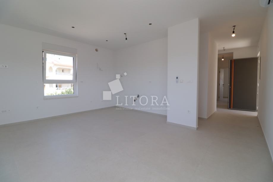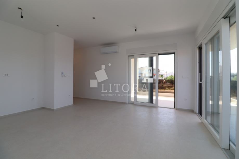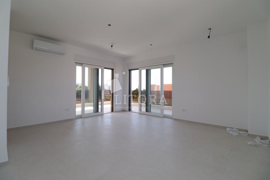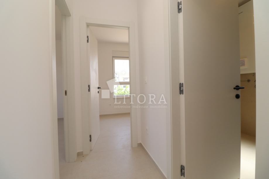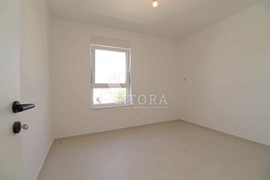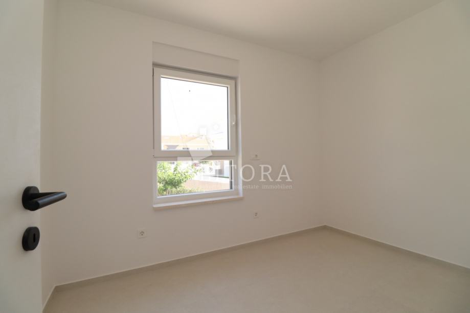 Apartman ima 89,42m2 korisne površine, smješten na 1.katu u sklopu manje višestambene zgrade. Orijentiran na južnu stranu s pogledom na more. Sastoji se od predsoblja, dvije kupaonice, tri spavaće sobe, dnevnog boravka s blagovaonicom i kuhinjom, s izlazom na nenatkrivenu terasu 19,06m2. Apartman je odmah useljiv, opremljen protuprovalnim vratima, klima uređajima u svakoj pro-storiji, električnim podizačima roleta, komarnicima. Pripada mu jedno vanjsko parkirno mjesto te spremište od 9,61m2 u suterenu zgrade. Udaljen 400 m od plaže i 850 m od centra grada.