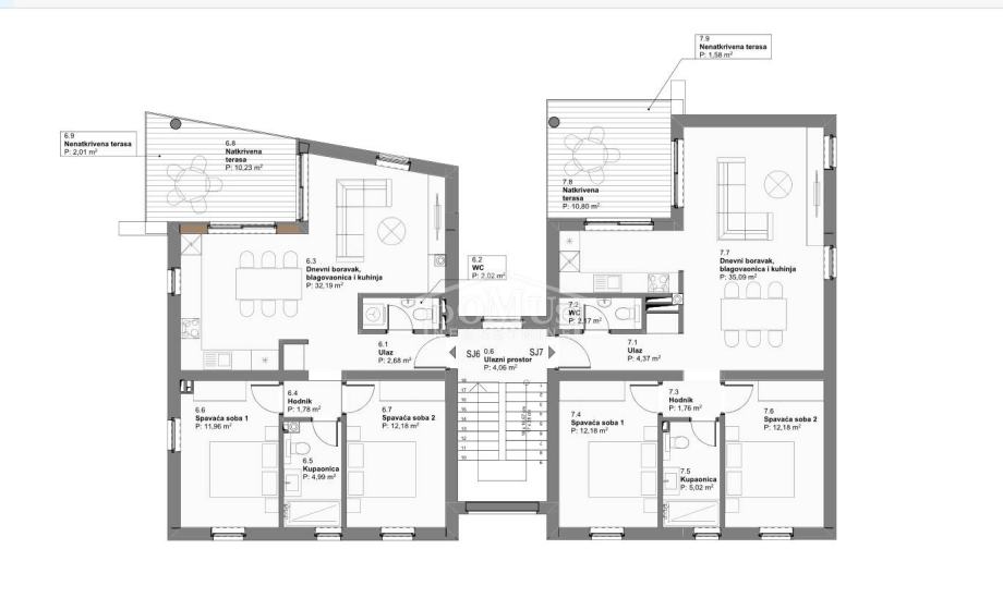 Stambena jedinica S7, nalazi se na 2. katu zgrade, orijentiran na jugozapadnu stranu, ima 81,50 m2 korisne površine, a sastoji se od ulaza, WC-a, hodnika, kupaonice, 2 spavaće sobe, kuhinje s blagovaonom i dnevnim boravkom te izlazom na prostranu terasu od 10,80 m2. Zgrada se nalazi samo 400m od Plave plaže, a od centra i svih bitnijih sadržaja 700m.