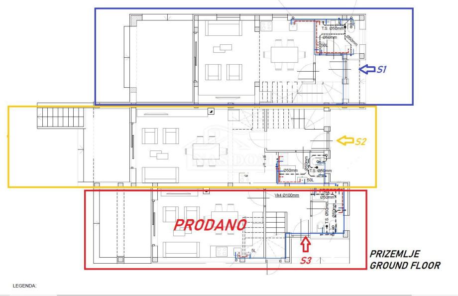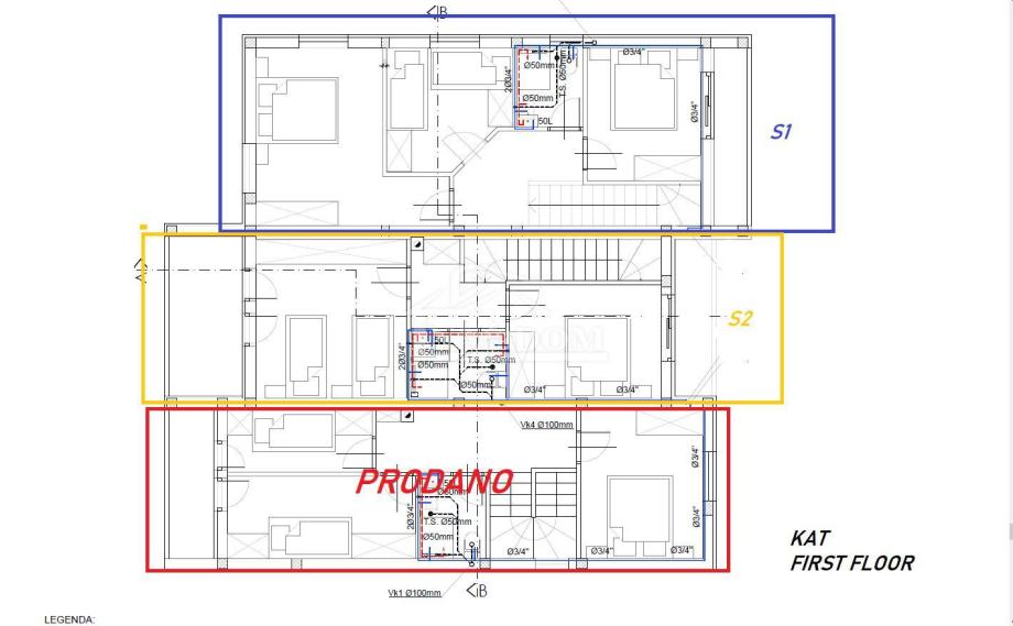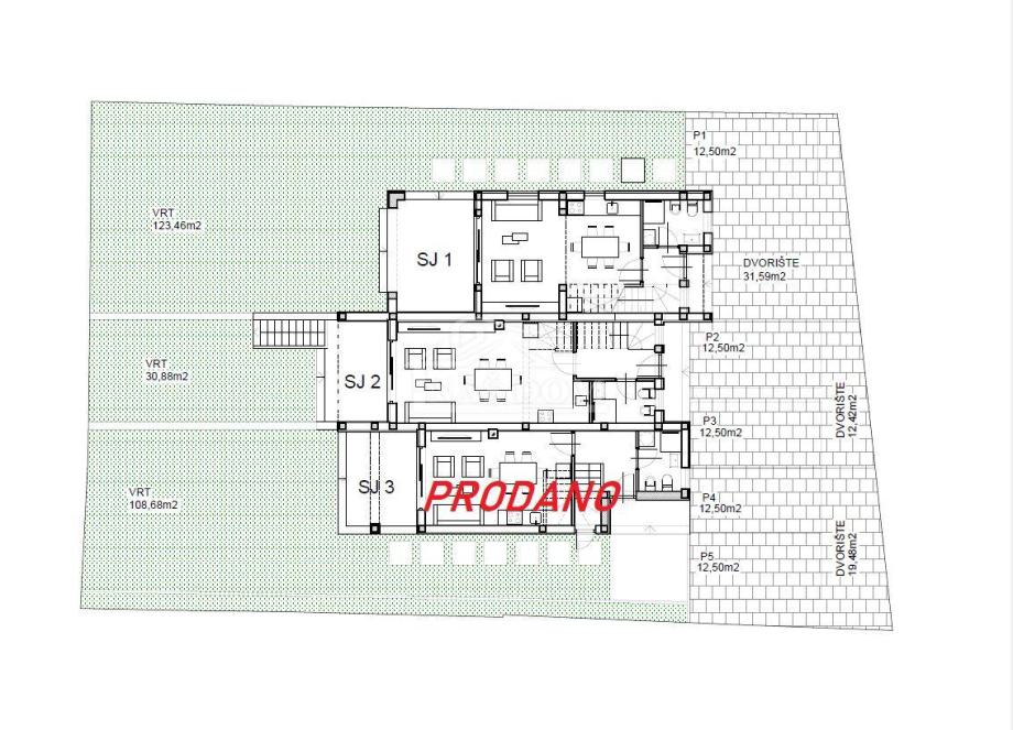 S2 stan ukupne neto površine 114,25 sastoji se od tri etaže : podrum , prizemlje +kat . U podrumu se nalazi spremište površine 26, 89m2. Prizemlje se sastoji od ulaz, kupaonica , stepenište , dnevni boravak , kuhinja i blagovaonica te lođa površine 9,94m2 s izlazom u vrt .Unutarnjim stepeništem se ide na kat stana koji se sastoji od hodnik , kupaonica , dvije spavaće sobe i dvije lođe. Stanu pripada vrt površine 30,88m2 , dva parkirna mjesta i dvorište površine 19,48m2. CIJENA : 377.025,00€