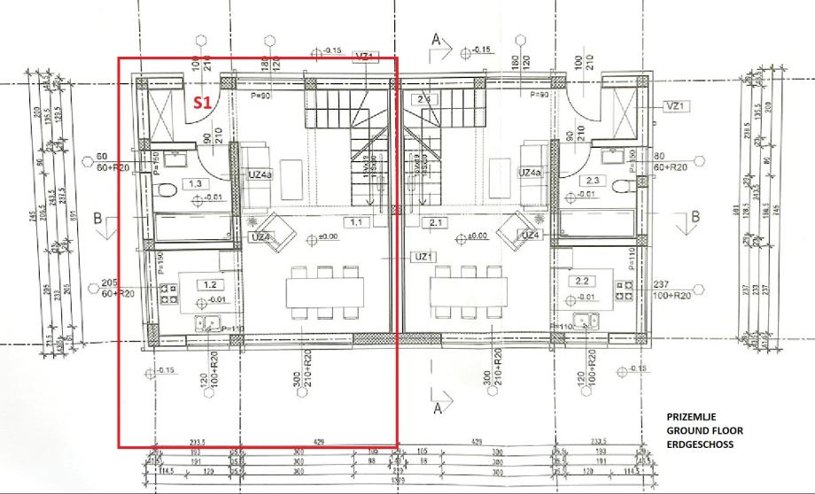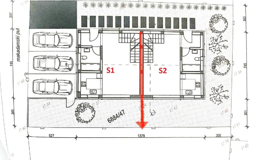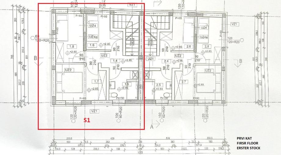 S1 STAN stambene površine 77,24m2 sastoji se od ulaz, kupaonica, kuhinja, blagovaonica i dnevni boravak s izlazom na terasu i vrt u prizemlju. Unutarnjim stubištem se ide na kat koji se sastoji od hodnika, tri spavaće sobe i kupaonica te izlaz na krovnu terasu. Stanu pripada vrt površine cca 30m2 i dva parkirna mjesta.