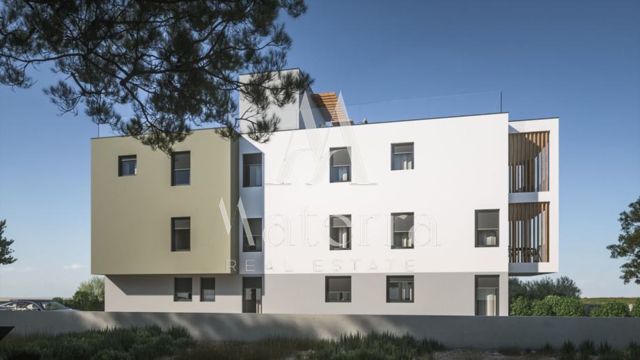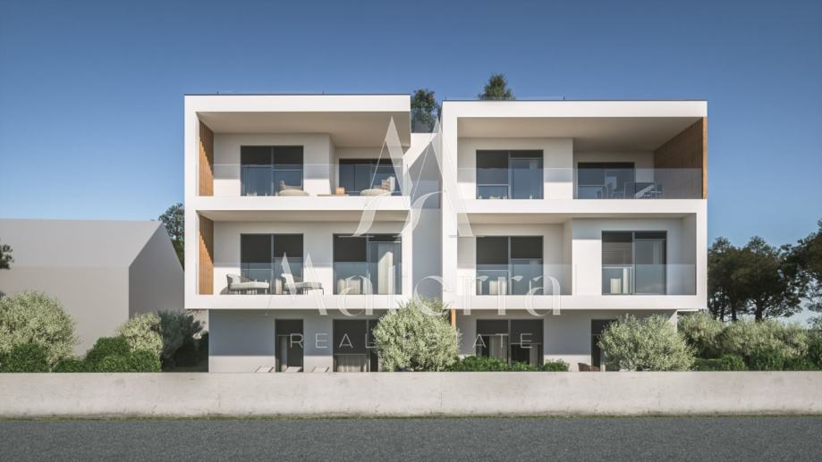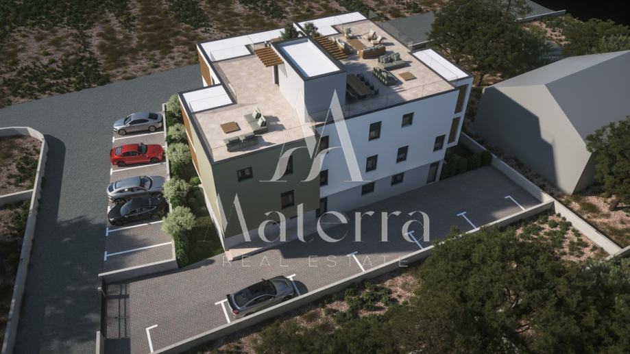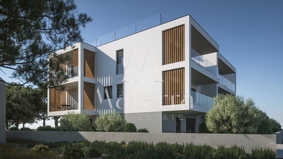 Na prodaju je stan A1 smješten u prizemlju moderne novogradnje u naselju Vodice, u neposrednoj blizini Šibenika. Ukupna površina stana iznosi 69,52 m², a sastoji se od ulaza, dnevnog boravka i kuhinje sa blagovaonom, dvije spavaće sobe, kupaone te izlaza na terasu i dvorište, sa vlastitim parkirnim mjestom. Zgrada se gradi prema suvremenim standardima gradnje, s naglaskom na kvalitetu materijala i završne obrade. U opremanju će se koristiti vrhunska stolarija, moderna keramika i visokokvalitetne sanitarije. Lokacija je izuzetno pogodna kako za svakodnevno stanovanje tako i za odmor, s obzirom na to da se plaža nalazi na svega 500 metara udaljenosti. Završetak gradnje planiran je za 2026. godinu.