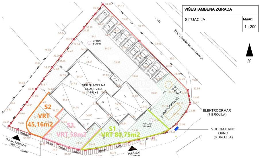Vodice, novogradnja, manja stambena zgrada s 6 stambenih jedinica raspoređenih na dvije etaže: prizemlje i prvi kat. Zgrada će biti spremna za useljenje do kraja svibnja 2025. godine. Stanovi su komfornog rasporeda, s prostranim terasama i pogledom na more. Stanovi u prizemlju imaju vlastita dvorišta, a zgrada ima i prostran parkirni prostor.