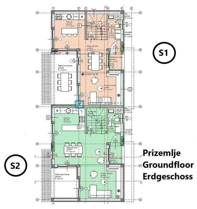 Kuća S2 neto korisne površine 138.98 m2 sastoji se od dvije etaže: prizemlje + 1. kat. U prizemlju se nalazi natkriveni ulaz, ulazni prostor, spremište, WC, kuhinja s blagovaonicom te izlaz na natkrivenu terasu i vrt. Unutarnjim stubištem dolazimo na 1. kat koji se sastoji od hodnika, tri spavaće sobe, garderobe, dvije kupaonice i natkrivene terase s koje se pruža pogled na more. Kući pripadaju dva parkirna mjesta. Postoji mogućnost izgradnje bazena.