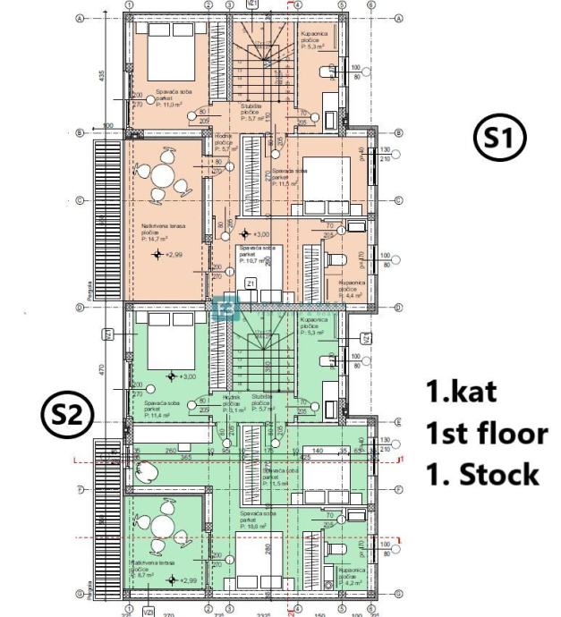 Kuća S1 neto korisne površine 186.78 m2 sastoji se od tri etaže: prizemlje + 1. kat + krovna terasa. U prizemlju se nalazi natkriveni ulaz, ulazni prostor, spremište, WC, kuhinja s blagovaonicom te izlaz na natkrivenu terasu, vrt, sunčalište i bazen površine 26.25 m2. Unutarnjim stubištem dolazimo na 1. kat koji se sastoji od hodnika, tri spavaće sobe, dvije kupaonice i natkrivene terase s koje se pruža pogled na more. Stubište vodi na prostranu krovnu terasu koja ima panoramskim pogledom na more i grad. Prostorija koja se nalazi na ovoj etaži sastoji se od ljetne kuhinje, stubišta i WC-a. Kući pripadaju dva parkirna mjesta. Cijena iznosi: 550.000 €.