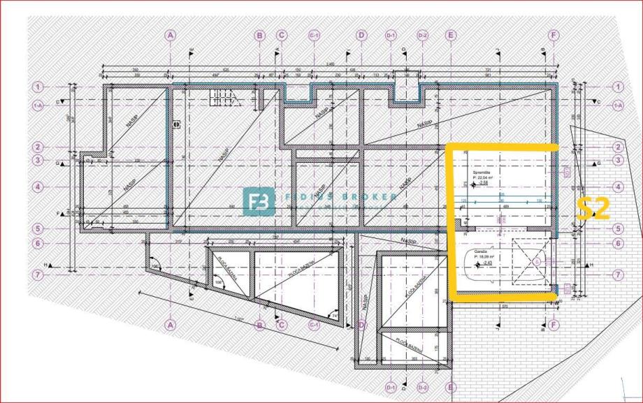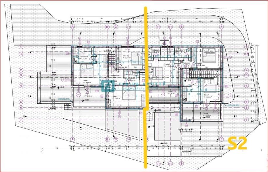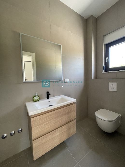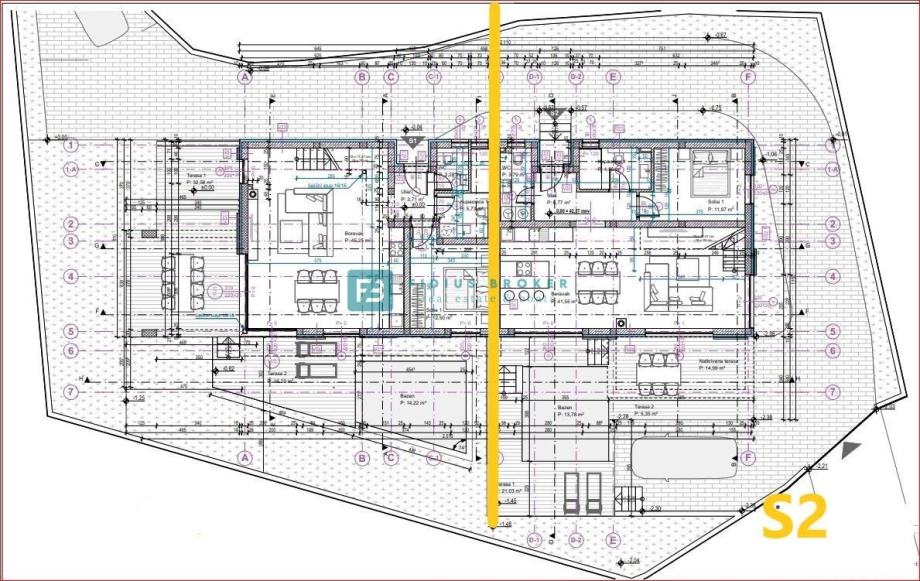 Kuća S2 korisne površine 192 m2 + garaža 40 m2 + dvorište 25 m2 + vrt 40 m2 + bazen 13 m2 + parking 12,50 m2 ima tri etaže: suteren + prizemlje + 1. kat. U suterenu je smještena garaža i prostrano spremište. Prizemlje se sastoji od natkrivenog ulaznog prostora, WC-a, spavaće sobe, kupaonice, kuhinje, blagovaonice i dnevnog boravka koji ima izlaz na terasu koja je spojena s bazenom i lijepo uređenim vrtom. Unutarnjim stubištem dolazimo na kat, gdje se nalaze tri komforne spavaće sobe, dvije kupaonice, te dvije terase koje imaju panoramski pogled na more. Kuća je kvalitetno građena i opremljena. Od opreme izdvajamo: stiropor fasada, protuprovalna vrata, visokokvalitetna PVC stolarija, ALU električne rolete s komarnicima, moderne kuponske sanitarije, keramički podovi vrhunske kvalitete, podno grijanje u svim prostorijama putem dizalice topline, klima uređaji u svakoj prostoriji, staklene ograde na terasama.