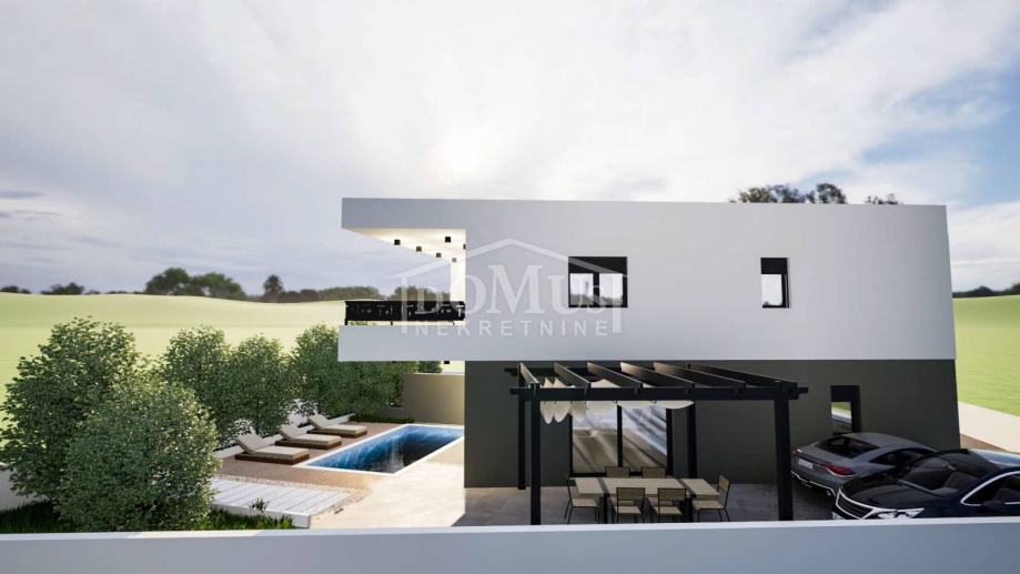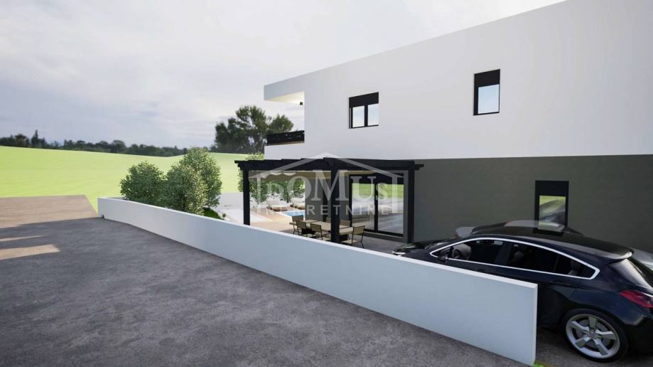 Novogradnja, moderna dvojna kuća funkcionalnog rasporeda, smještena u mirnom dijelu Vodica. Kuća je na dvije etaže (prizemlje + 1. kat) sa 111,63 m² ukupne neto površine, okućnicom i bazenom. Prizemlje se sastoji od ulaznog hodnika, kupaonice, spremišta te prostranog dnevnog boravka s kuhinjom i blagovaonicom s izlazom na natkrivenu terasu površine 13,79 m² i nenatkrivenu terasu površine 31,36 m², vrt i bazen. Unutarnje stepenice vode na 1. kat gdje su smještene tri spavaće sobe, kupaonica i hodnik, a dvije sobe imaju izlaz na natkrivenu terasu površine 15,25 m². Kuća je opremljena kvalitetnim materijalima: PVC stolarija s roletama, termo fasada, podno grijanje u dnevnom boravku i kupaonicama te klima uređaji za grijanje i hlađenje. Kuća ima dva parkirna mjesta. Udaljenost 700 m od centra i 900 m od uređene plaže.