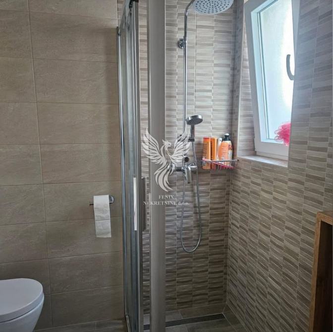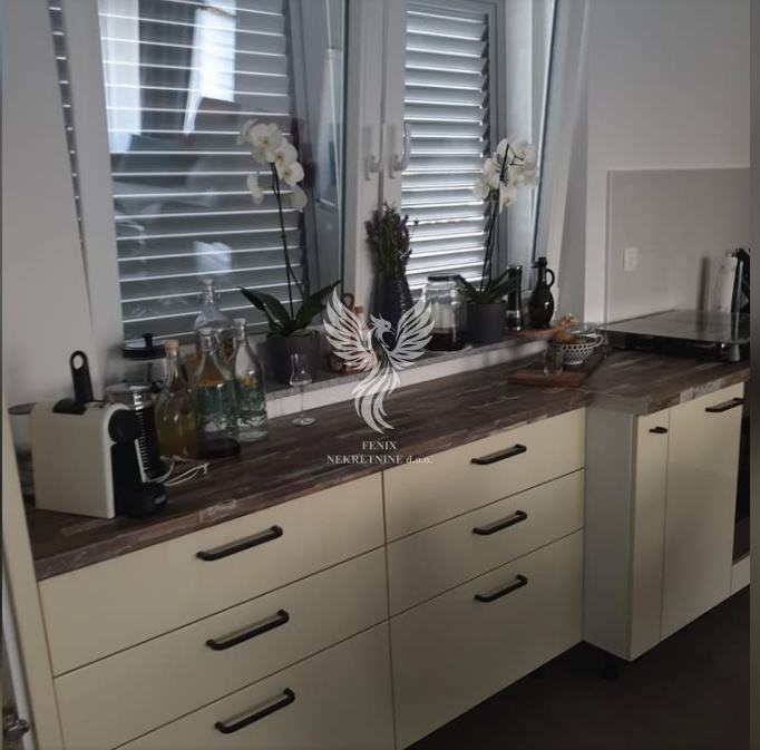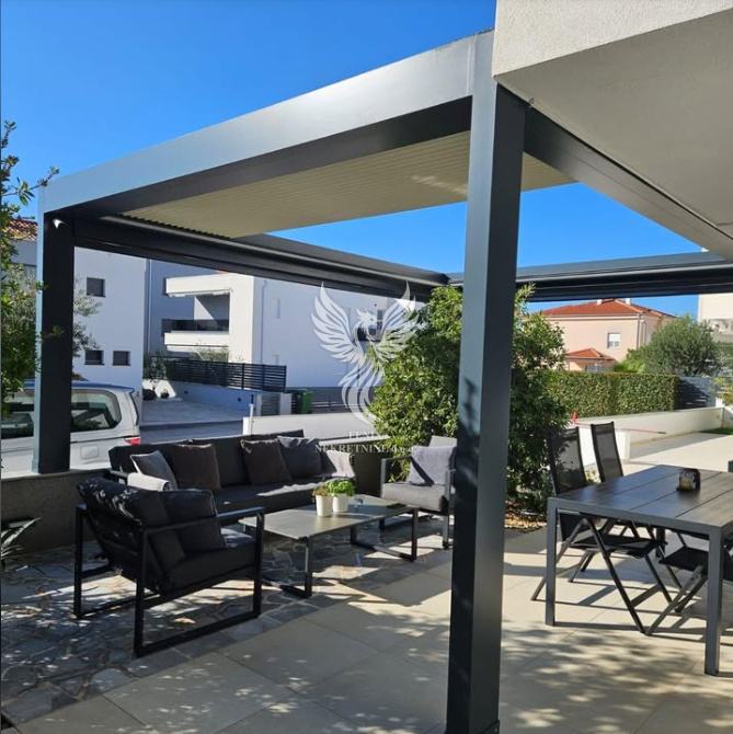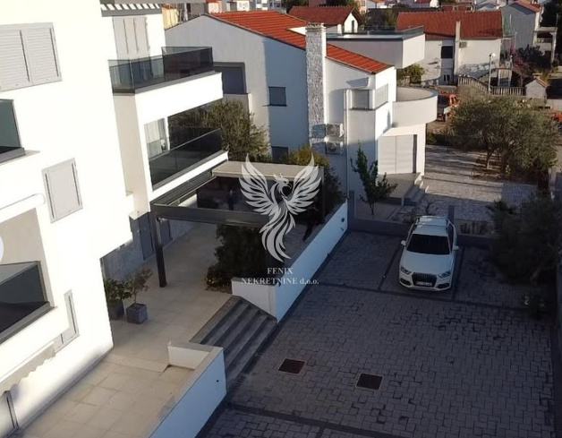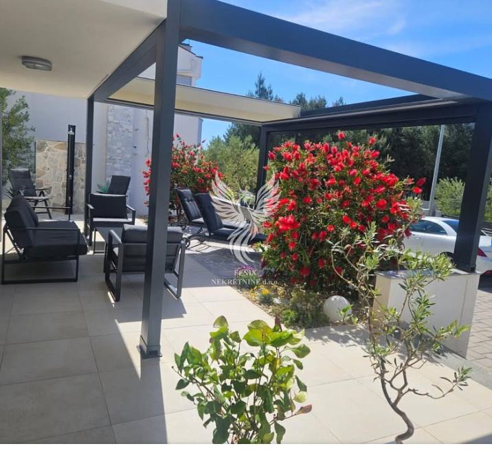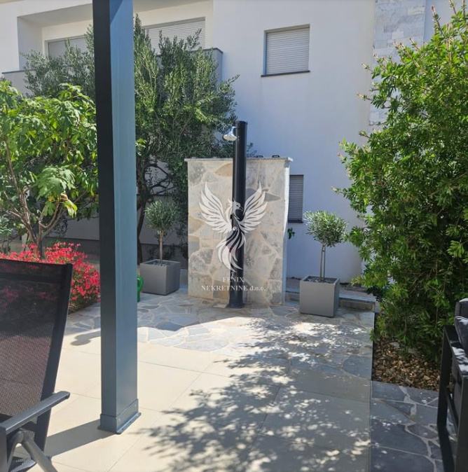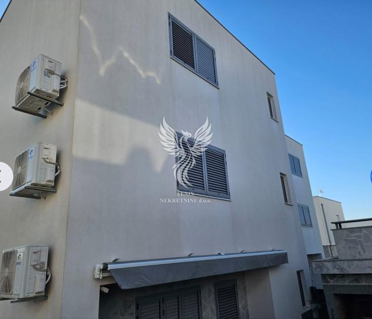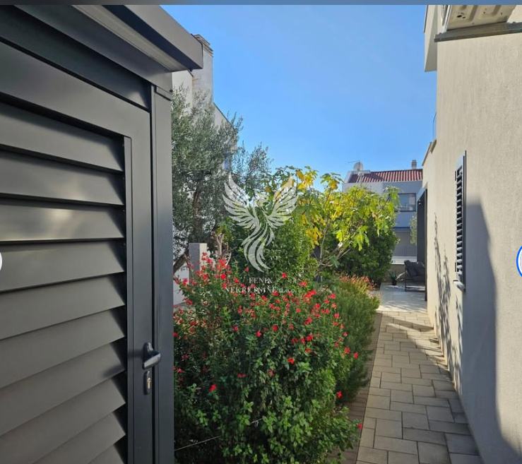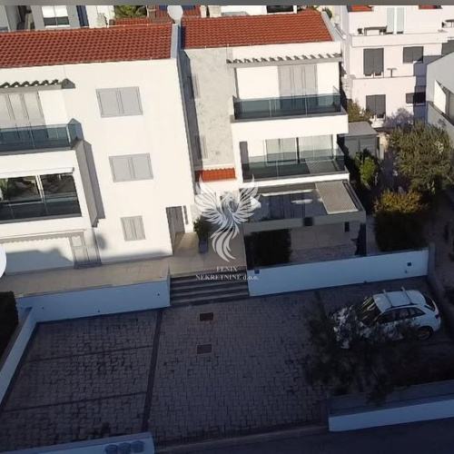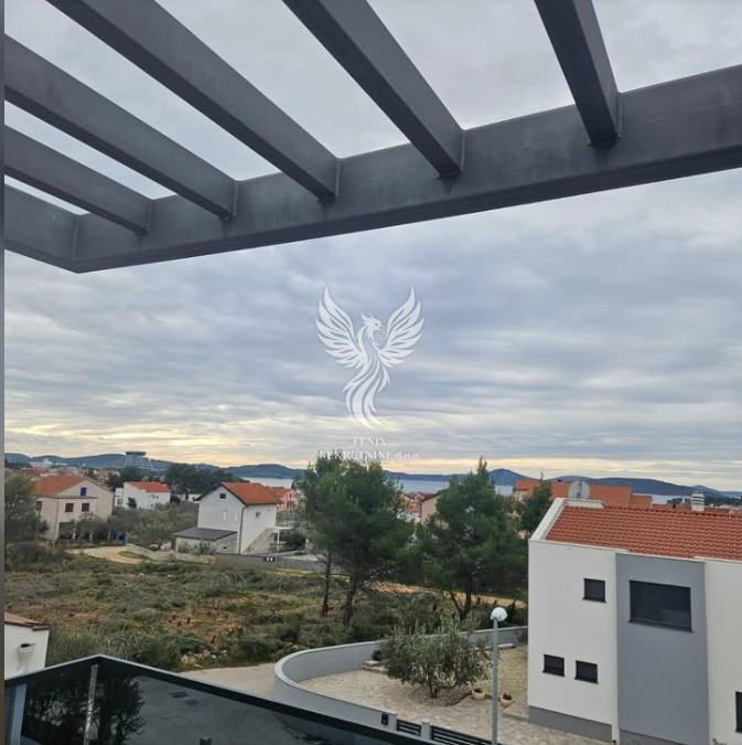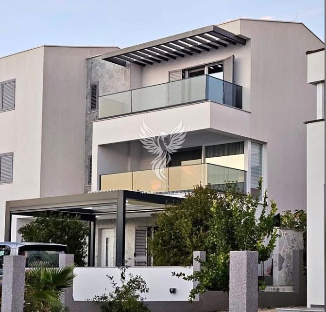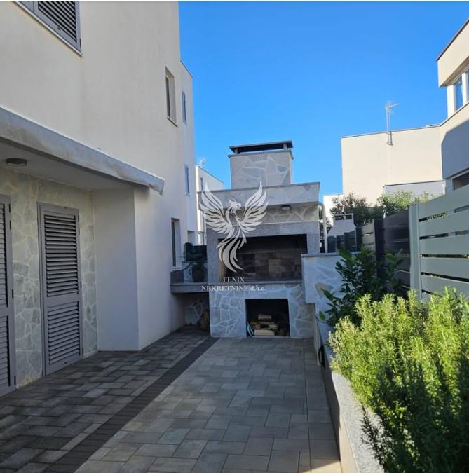 Kuća se nalazi u širem centru Vodica. Blizina rive i ACI Marine (700 m), magistrale (300 m), restorana, trgovina i ostalog potrebnog sadržaja. Kuća je izgrađena i dovršena 2019. godine. Nalazi se na zemljištu površine 563 m2 koje dijeli s drugim dvojnim objektom na koji je naslonjena. Ukupna površina kuće sa svim pripadcima iznosi 152.43 , od čega je stambeno 134.52 m2, okućnica (vrt) 92.50 m2 i tri vanjska parkirna mjesta svaki po 12.50 m2. Kuća se prostire na tri etaže: prizemlje, prvi i drugi kat. Prizemlje se sastoji od: ulaznog prostora, dnevnog boravka, kuhinje s blagovaonicom, spavaće sobe, dvije terase, kupaonice i spremišta, ukupne površine 56.92 m2. Unutarnje stepenice vode do prvog kata koji se sastoji od: dnevnog boravka, kuhinje s blagovaonicom, balkona, kupaonice i stubišta ukupne površine 50.87 m2. Drugi kat, a do kojeg se dolazi također unutarnjim stepenicama se sastoji od: hodnika, dvije spavaće sobe, balkona i kupaonice ukupne površine 49.87 m2. Prvi i drugi kat se mogu formirati kao jedna cjelina, u dvoetažni stan ukupne površine 100.74 m2. S gornje terase pruža se prekrasan pogled na more i na sam grad Vodice. Kuća je relativno nova. Objekt je sagrađen i uređen po najnovijim standardima po principu urbane vile sa svim potrebnim sadržajima kao što su: podne hidroizolacije i izolacije u kupaonicama,rol-ugradnja vanjske stolarije, podno grijanje u kupaonicama, internet, satelitska televizija, vanjska aluminijska i unutarnja PVC stolarija, stiropor fasada debljine 10 cm, staklene ograde, portafon, klima uređaji grijanje/hlađenje u svim prostorijama i dr. Postoji i mogućnost ugradnje kamina (dimnjak je postavljen), a vrijedi istaknuti i da je odrađena i priprema za centralno grijanje. U dvorištu se nalazi vanjska rasvjeta na senzor, roštilj, a terasa je natkrivena pokretnom tendom. U dvorištu se nalazi i solarni tuš. Kuća se do sada nije iznajmljivala, ali otvorena je i ta mogućnost s obzirom da je kategorizirana kao kuća za odmor kategorije 4 zvjezdice. Kuća posjeduje svu dokumentaciju: građevinsku i uporabnu dozvolu, uredan vlasnički list i energetski certifikat A.