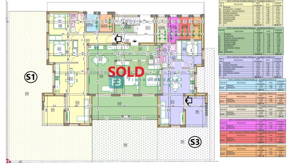 Stan S3 nalazi se u prizemlju ukupne korisne površine 58,75m2 (stambena površina 45,67 m2 + terasa 10,99 m2 + vrt 50,92 m2 + parking 12,50 m2). Sastoji se od spavaće sobe, kupaonice, kuhinje s blagovaonicom i dnevnog boravka s izlazom na lijepu terasu površine 10,99 m2 i vrt površine 50,92 m2. Stanu pripada 1 parking mjesto. Cijena iznosi 182.500 € (PDV uključen - kupac je oslobođen plaćanja 3% poreza na promet nekretninama).