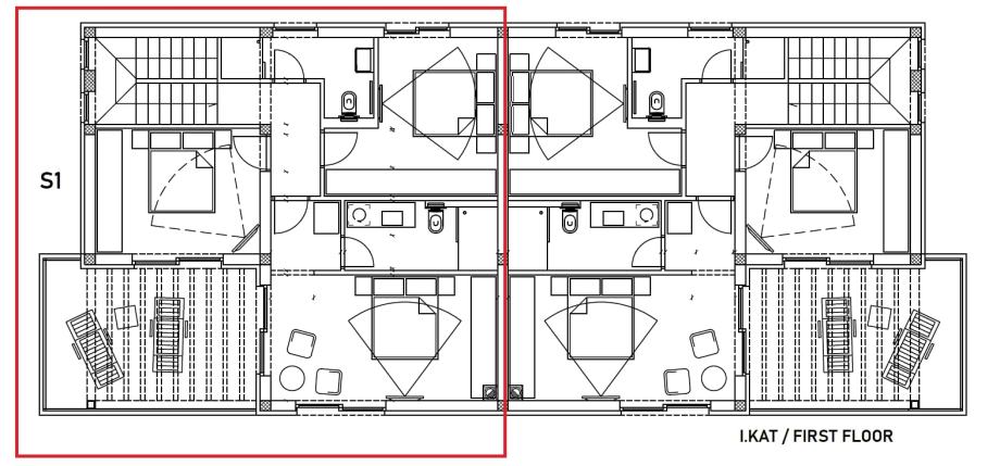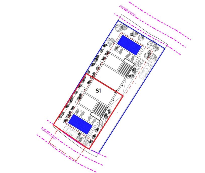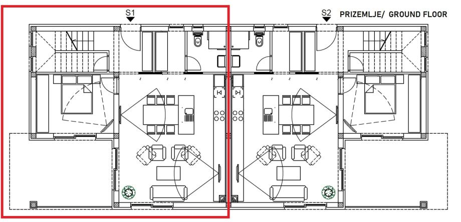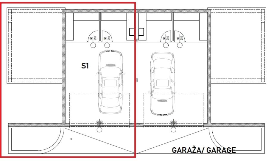Vodice-**NOVOGRADNJA** *POGLED NA MORE* prodaje se dvojna kuća s bazenom, podrumom i garažom. Kuća S1 neto površine 238,13m2 sastoji se od tri etaže: podrum+prizemlje +kat kuće. U podrumu se nalazi garaža s dva parkirna mjesta , ostava i strojarnica za bazen. Prizemlje se sastoji od ulaz, predsoblje, stubište , kupaonica, spavaća soba i kuhinja s blagovaonicom i dnevni boravak open space rasporeda s izlazom na natkrivenu terasu površine 43,75m2 , sunčalište i bazen. Unutarnjim stubištem se ide na kat kuće koji se sastoji od hodnik, kupaonica, dvije spavaće sobe i master spavaća soba s vlastitom kupaonicom te natkrivena terasa površine 18,99m2.