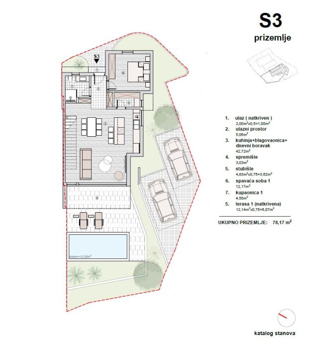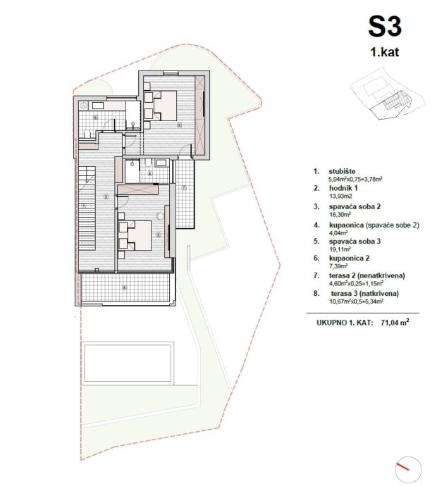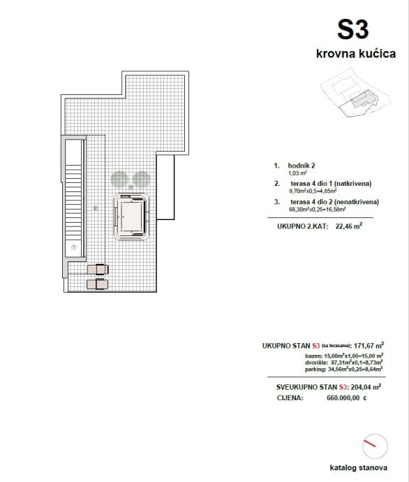 S3 stan ukupne neto površine 204.04 m2 sastoji se od tri etaže: prizemlje +kat+krovna terasa. Prizemlje neto površine 78.17 m2 m2 sastoji se od ulazni prostor,spremište, kupaonica, spavaća soba, kuhinja s blagovaonicom i dnevni boravak open space rasporeda s izlazom na natkrivenu terasu površine 12.14m2 u nastavku koje se nalazi bazen površine 15 m2. Unutarnjim stubištem se ide na kat stana neto površine 71.04m2 i koji se hodnik, spavaća soba s izlazom na terasu površine 4.60m2, kupaonica te master spavaća soba s vlastitom kupaonicom i izlazom na natkrivenu terasu površine 10.67m2. Unutarnjim stubištem se ide na zadnju etažu koja se sastoji od hodnika, te krovne terase ukupne površine 76 m2 koja se sastoji od natkrivene i nenatkrivene terase. Stanu pripada i dvorište /vrt površine 87.31, parkirni prostor površine 34.56 m2.