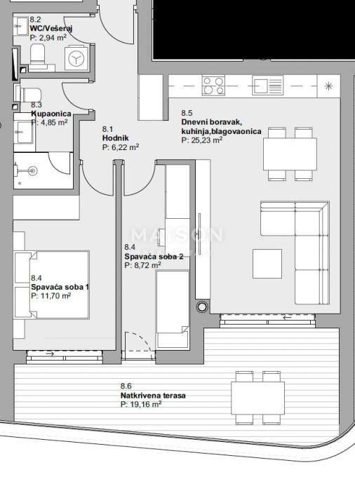 Stan ima neto površinu od 78,82 m², a sastoji se od prostranog dnevnog boravka s blagovaonicom i kuhinjom, dvije udobne spavaće sobe, hodnika, kupaonice, odvojenog toaleta, te izlaza na terasu – natkrivena terasa od 19,16 m² idealna za uživanje na otvorenom.
