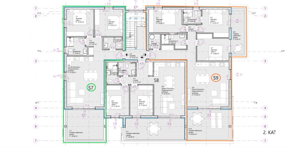 Vodice novogradnja, stambena zgrada sa ukupno 9 stambenih jedinica. Stan "S9" se nalazi na 2. katu, ima stambenu površinu 108,39 m² i sastoji se od ulaznog hodnika, kupaonice, tri spavaće sobe od kojih jedna soba ima vlastitu kupaonicu i izlaz na terasu, kuhinje s blagovaonicom i dnevnog boravka s izlazom na veliku natkrivenu terasu 20,64m2 sa koje se pruža panoramski pogled na more. Stan je modernog dizajna i funkcionalnog rasporeda, opremljen sa klima uređajima u dnevnom boravku i spavaćim sobama, električnim podnim grijanjem u kupaonici i dnevnom boravku, protuprovalnim ulaznim vratima, PVC stolarijom, električnim podizačima roleta, te modernom kupaonskom opremom. Stanu pripadaju dva vanjska parkirna mjesta. Stan se nalazi 1200 m od mora kao i centra grada te svih važnih sadržaja. Predviđeni datum useljenja je ljeto 2026. g. Kupac je oslobođen plaćanja poreza na promet nekretnina.