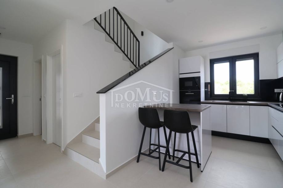 Prekrasna obiteljska kuća moderne arhitekture i vrlo funkcionalnog rasporeda u Vodicama na mirnoj lokaciji, udaljen 950m od šljunčane plaže a 750m od centra grada. Kuća je dvojni objekt, (zapadna strana) na dvije etaže: Prizemlje + 1.kat sa 125,62m2 sveukupne korisne površine te 230m2 okućnice sa vanjskim bazenom od 21m2 te prostranim parkirnim prostorom. Prizemlje ima prostrani dnevni boravak, kuhinju i blagovaonicu, spremište, kupaonicu, predsoblje i veliku terasu u sklopu bazena. Na 1. katu su smještene tri spavaće sobe, kupaonica, Wc i lođa. Kuća se gradi modernim i kvalitetnim materijalima kao što je: termo fasada 10 cm, stolarija antracit boje sa električnim podizačima roleta i komarnicima, u kupaonicama moderna sanitarija, podno grijanje na struju u svim kupaonicama u prizemlju i na katu, sve spavaće sobe i dnevni boravak su opremljeni sa dizalicama topline. Kuća ima dva popločana parkirna mjesta.