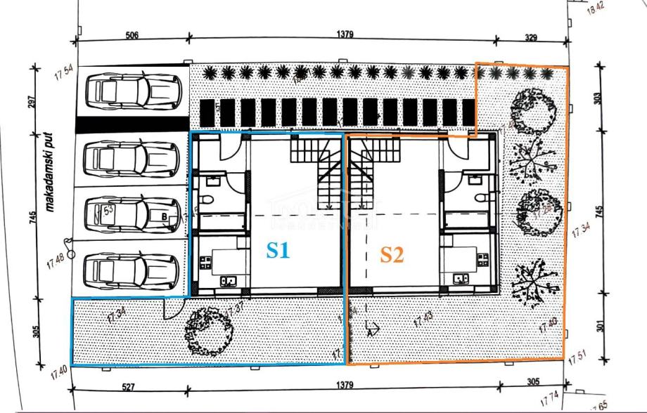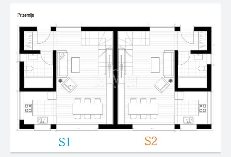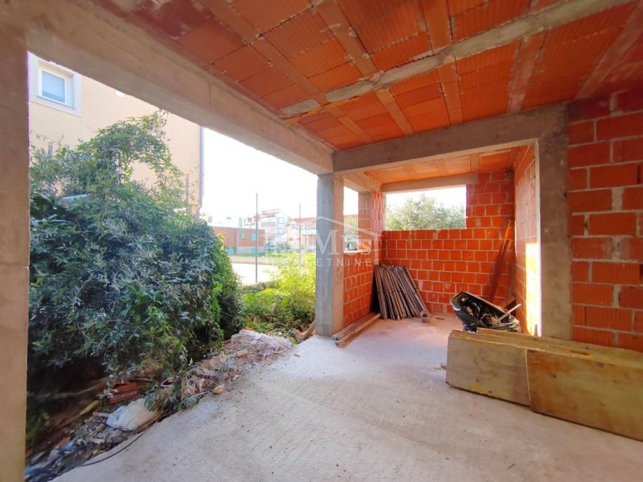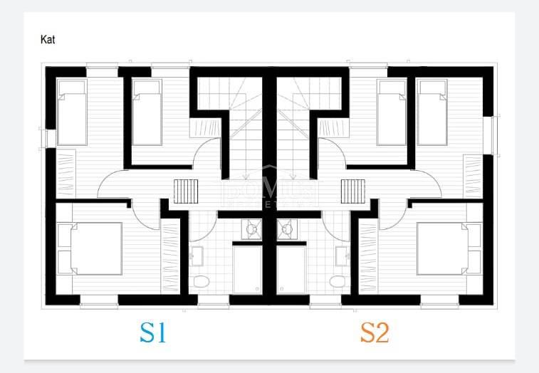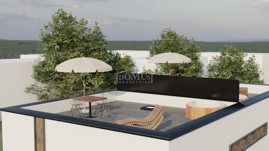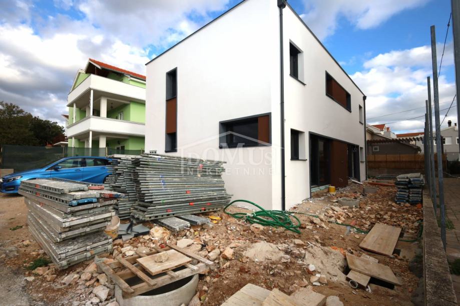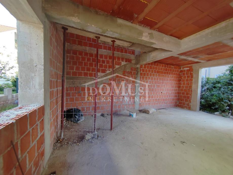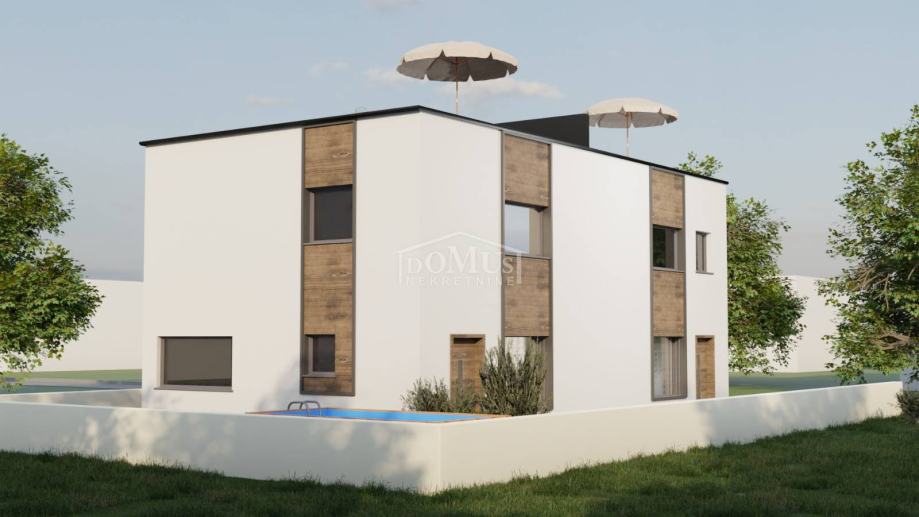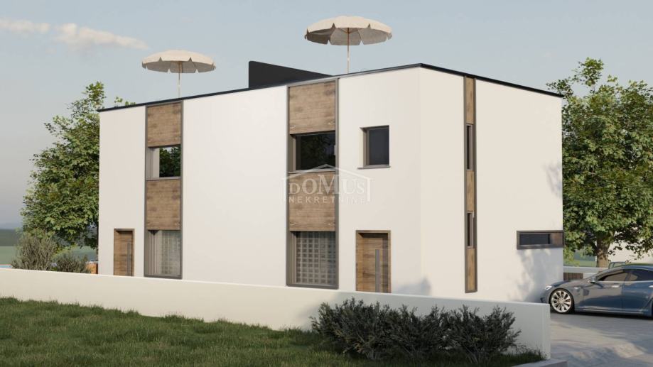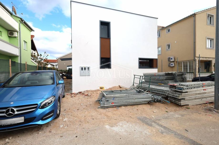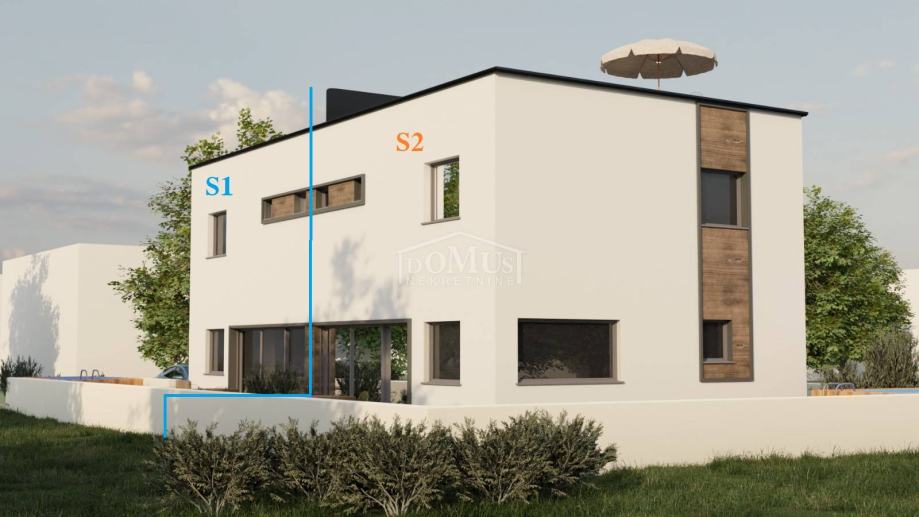 Prekrasna obiteljska kuća moderne arhitekture i odličnog rasporeda na mirnoj lokaciji koja svojim budućim vlasnicima osigurava uživanje i odmor od svakodnevne gužve. Kuća je dvojni objekt, na dvije etaže (prizemlje + 1. kat) sa 77,24m2 stambene površine sa prekrasnom okućnicom od cca. 30m2 te parkirnim prostorom za 2 auta. Prizemlje se sastoji od hodnika / predsoblja, kupaonice, velikog dnevnog boravka i blagovaonicom, kuhinje te izlaz u vrt. Unutarnje stepenice vode na 1. kat gdje se nalazi hodnik, tri spavaće sobe te kupaone. Na kući je moguće urediti i ravni krov u dodatnu krovnu terasu od 40m2. Kuća će biti opremljena sa protuprovalnim vratima, PVC stolarijom sa roletama (el. podizači roleta) , visokokvalitetna podna obloga keramike, podno grijanje u svim kupaonicama i kuhinjom, klima uređaj u dnevnom boravku te na 1.katu hodniku, instalacije za telefon i Internet, sat TV. Kuća je udaljena 950m od plaže i 1300m od centra mjesta.