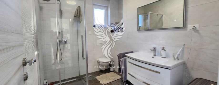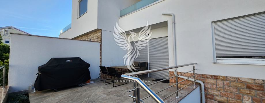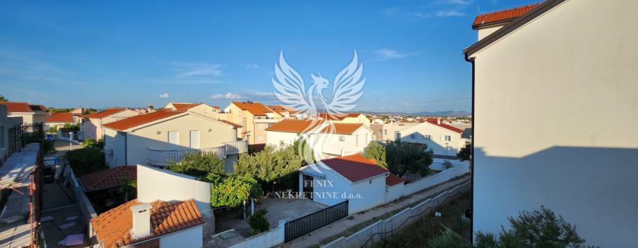 Prodaje se odličan dvoetažni stan u novogradnji u Vodicama, u mirnoj ulici, udaljen od centra mjesta 1 km. Stan je koncipiran kao dvojni objekt s prizemljem i prvim katom, te pripadajućem garažom i dvorištem. U prizemlju objekta se nalazi hodnik, kuhinja s blagovaonicom i dnevnim boravkom, kupaonice, ostave, spremišta i dijelom natkrivene terase, na katu objekta se nalazi hodnik, tri spavaće sobe, kupaonica, te dvije terase. Objektu pripada veliki dvorišni dio, na kojem se nalaze dva vanjska parkirna mjesta, te je u garaži predviđeno parkiranje još jednog vozila. Stan se prodaje s namještajem, koji je u većoj mjeri izrađen po mjeri. Sustav grijanja i hlađenja su inverter klima uređaji. Vlasništvo uredno.