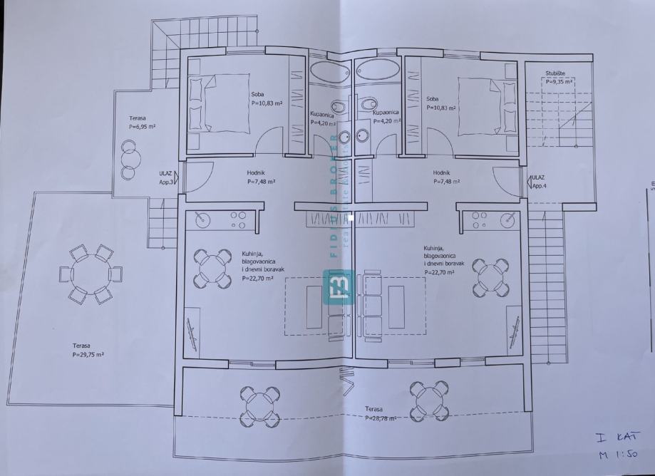 Vanjsko stubište vodi na 1. katu gdje se nalaze identični jednosobni stanovi S2 i S3 i sastoje se od ulaza, hodnika, kupaonice, spavaće sobe, kuhinje s blagovaonicom i dnevnim boravkom s izlazom na zajedničku terasu površine 28,78 m2. Stanu S3 pripadaju dvije terase.