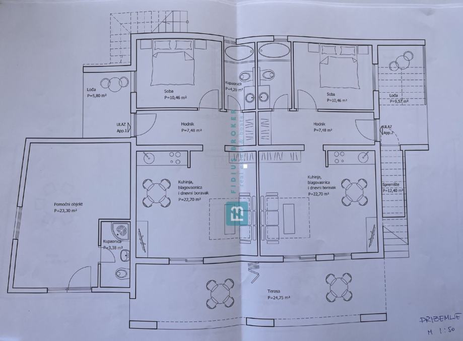U prizemlju su smještena dva jednosobna stana S1 i S2, identičnog rasporeda i sastoje se od lođe ispred ulaza, hodnika, spavaće sobe, kupaonice, kuhinje s blagovaonicom i dnevnog boravka s izlazom na zajedničku terasu površine 24,75 m2. Stanu S2 pripada vanjsko spremište. Pomoćni objekt se nalazi u prizemlju i u naravi je studio apartman s kupaonicom.