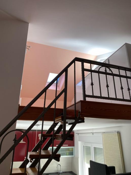 Na katu i potkrovlju nalaze se dva dvoetažna 3- sobna strana (identičnog rasporeda), čiji tlocrt čine: ulazni hodnik, open space u kojem su smješteni kuhinja sa blagovaonicom i dnevni boravak, spavaća soba, kupaonica sa WC-om te još jedna soba na galeriji (najveći dio galerije ima normalnu stajaću visinu). Stanovi imaju terase sa otvorenim pogledom na more.