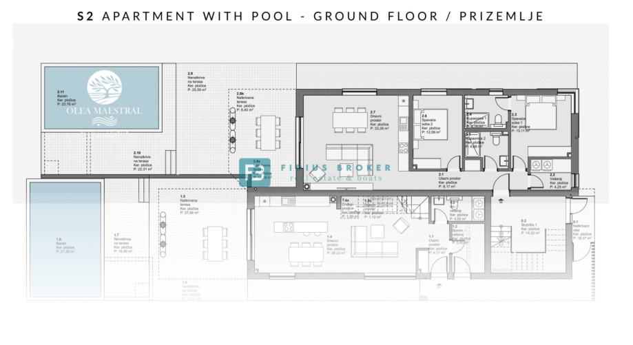 Dvoetažni stan S1 ima 165,37 m2 neto korisne površine (109,27 m2 stambene površine + terasa + bazen 27,26 m2 + vrt 145,02 m2 + parking) i proteže se na dvije etaže: prizemlje + 1. kat. Sastoji se od ulaznog prostora, zasebne kupaonice, spremišta, WC/praonice, open space kuhinje s blagovaonicom i dnevnim boravkom koji ima izlaz na natkrivenu i nenatkrivenu terasu, vrt, bazen i sunčalište. Unutarnje stubište vodi na kat gdje se nalaze tri spavaće sobe od kojih jedna ima vlastitu kupaonicu i izlaz na natkrivenu terasu. Prostrani stan ističe se modernim dizajnom i funkcionalnim rasporedom, koji osigurava veću privatnost i maksimalnu udobnost stanovanja. Jedna od glavnih prednosti ove nekretnine je privatni bazen i uređeno dvorište, idealno za opuštanje i uživanje na otvorenom. Stanu pripada jedno parking mjesto oznake PM1. Cijena iznosi 525.600 €.