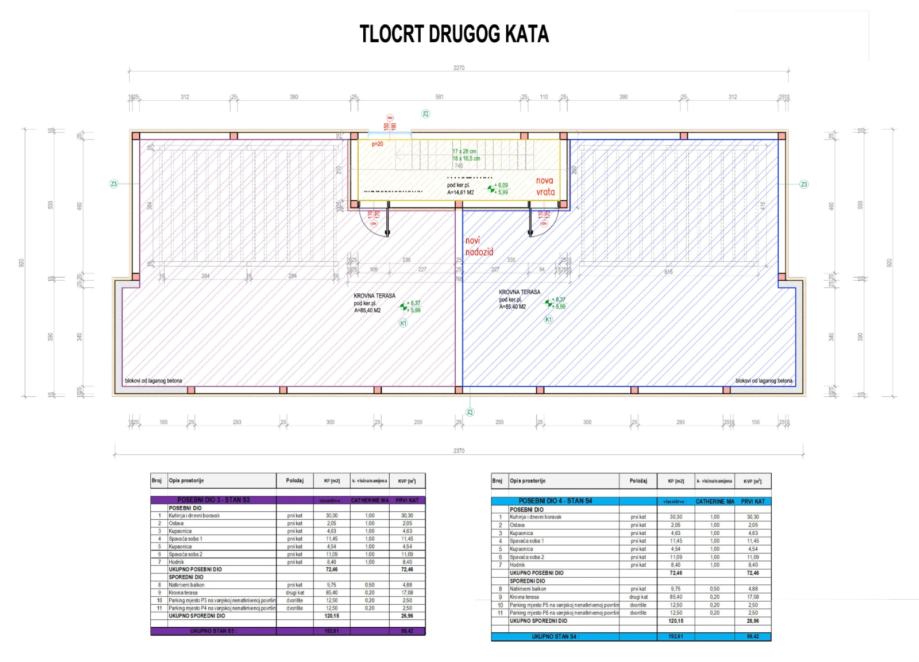 S3/S4 (prvi kat): 72.46 m2 unutarnji prostor, 9.75 m2 natkriveni balkon, 85.40 m2 krovna terasa, dva parkirna mjesta od 12.50 m2 svako, za 99.42 m2 neto stambene površine s uračunatim koeficijentima, po cijeni od € 308.000.