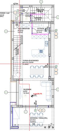 Na prvoj etaži: ulazni prostor s garderobom i stepeništem koje vodi ka drugoj etaži, gostinskog WC-a, otvorenog koncepta kuhinje, blagovaone i dnevnog boravka s izlazom na natkrivenu terasu.