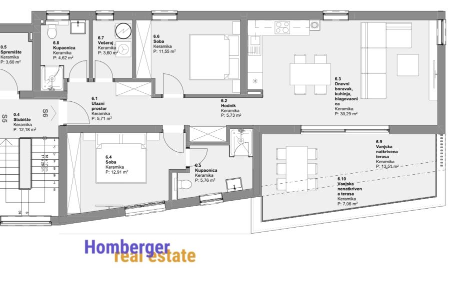 Penthaus stan S6 nalazi se na drugom katu, ima 88,84m2 netto korisne poivršine, te se sastoji od: ulazni prostor, kupaonica, vešeraj, hodnik, spavaća soba 1, spavaća soba 2 s kupaonicom, kuhinja i blagovaonica, dnevni boravak, sa izlazom na natkrivena i nenatkrivena terasa od 20m2 sa pogledom na more, te jedno parking mjesto.
